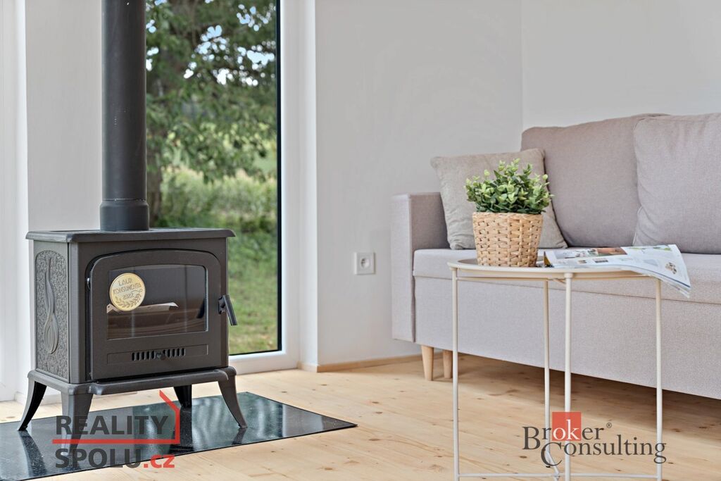V přízemí se nachází koupelna, kuchyňský kout a útulný obývací prostor s krbem. Otevřený loftový prostor pokračuje do patra, kde je umístěné spaní. Atmosféru doplňuje venkovní terasa ideální pro posezení a odpočinek.