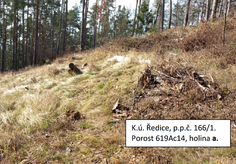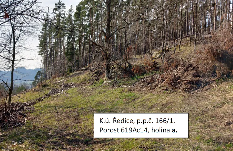 vrcholu kopce (552 m.n.m). Pozemky jsou s lesním porostem, tvoří samostatný celek v polích. Jedná se o les hospodářský.