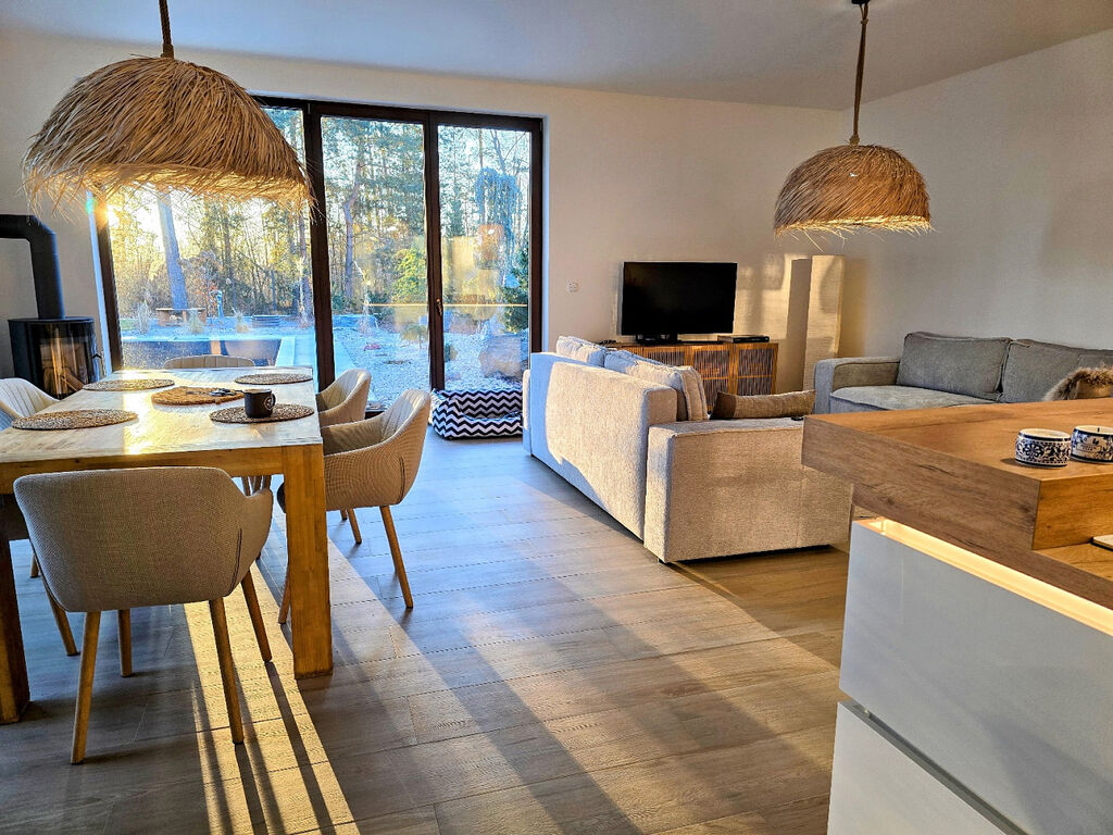 Obytná část je napojena na dřevěnou terasu se zahradou, kam díky francouzským oknům projdete z každého pokoje.