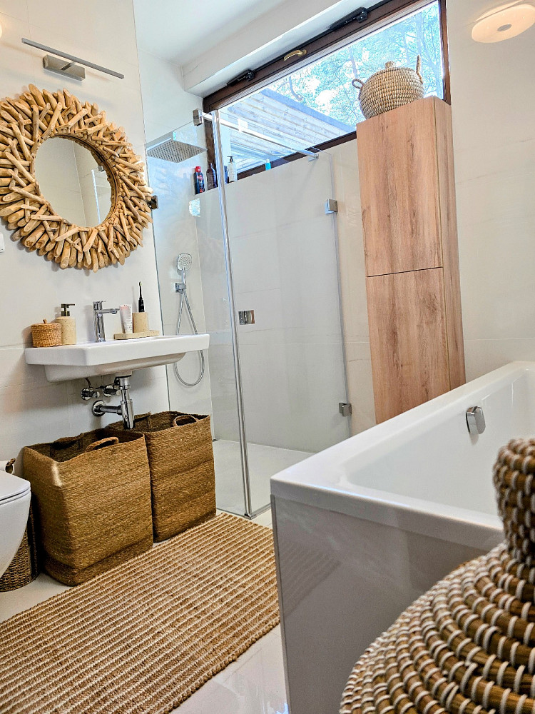 Do domu lze vstoupit buď hlavními vchodovými dveřmi, nebo rovnou z garáže přes technickou místnost se sprchovým koutem a plnoautomatickým plynovým kotlem, který zajišťuje nejen zdroj tepla pro vytápění, ale i ohřev vody.