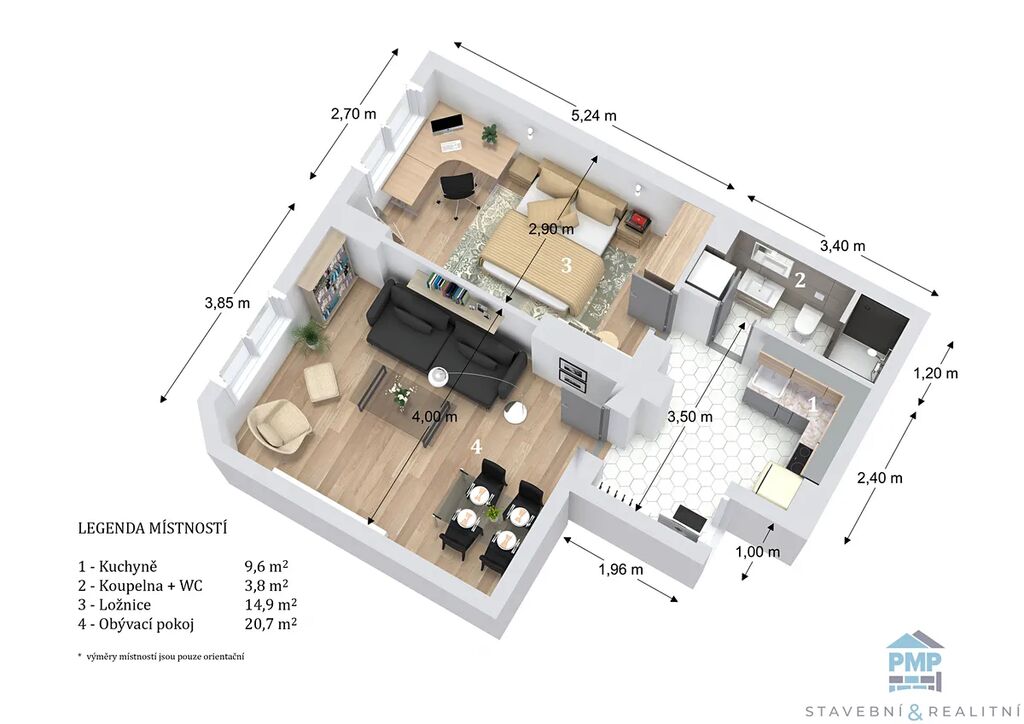 Kuchyně o velikosti 9,6 m² poskytuje dostatek prostoru pro vaření, zatímco obývací pokoj s rozlohou 20,7 m² je dominantou bytu a nabízí především pohodlné místo pro relaxaci. Ložnice o výměře 14,9 m² je ideální pro klidný spánek. Koupelna s toaletou o rozloze 3,8 m² je po rekonstrukci v moderním stylu.