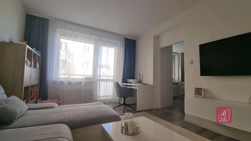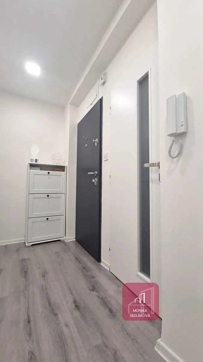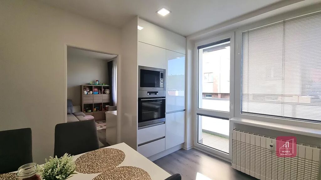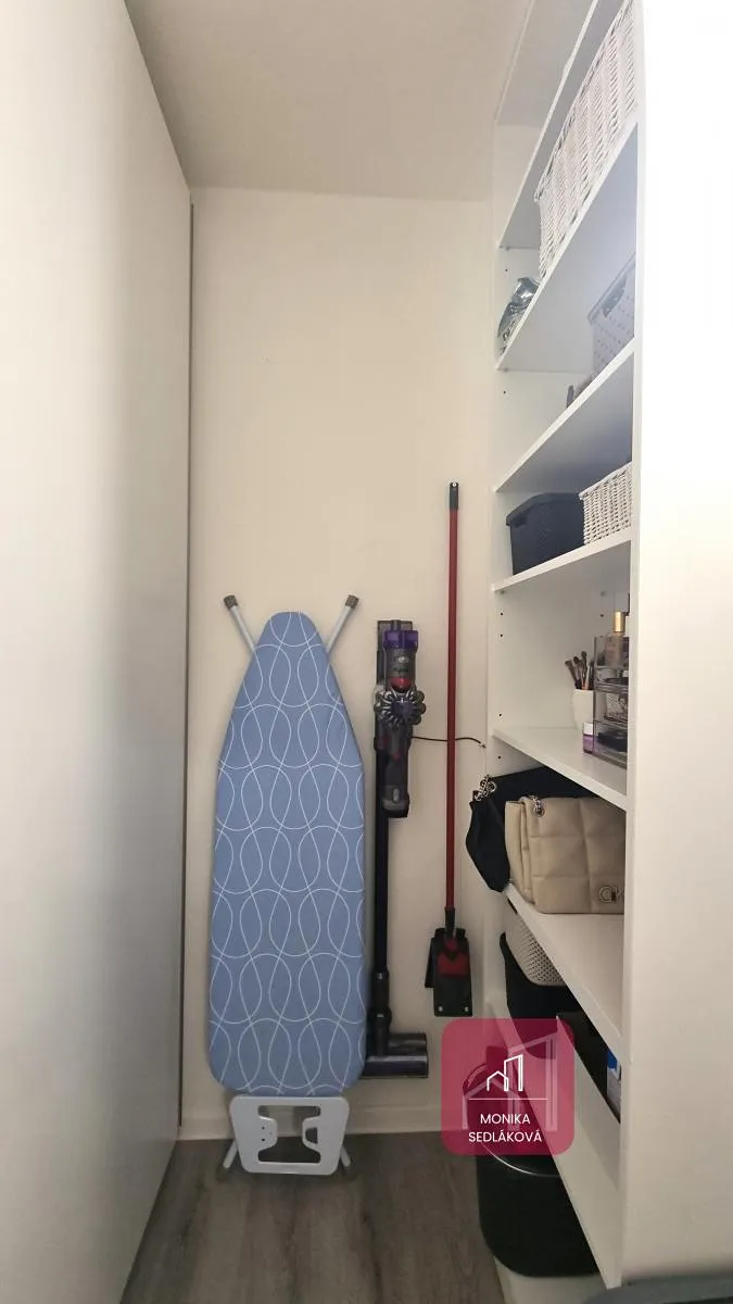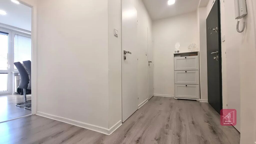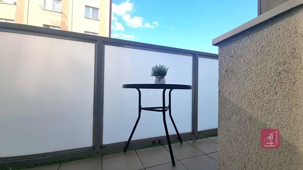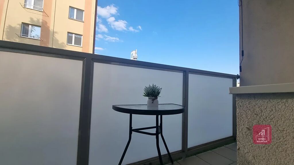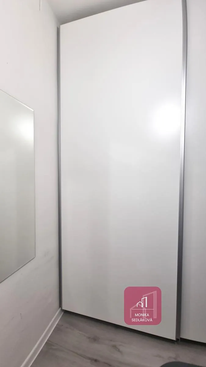Byt je orientovaný na východ a nabízí se částečně vybavený. Zůstává moderní kuchyňská linka se spotřebiči, jídelní stůl se židlemi, kompletní šatna s vestavěnou skříní, regály a komoda v obývacím pokoji.