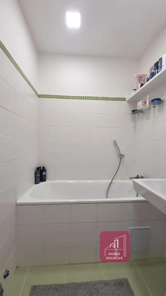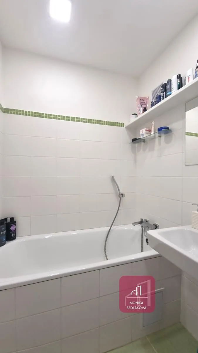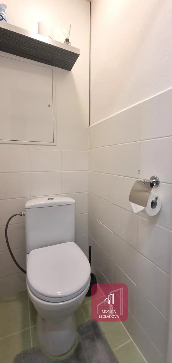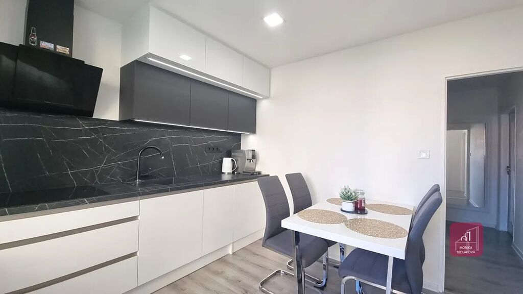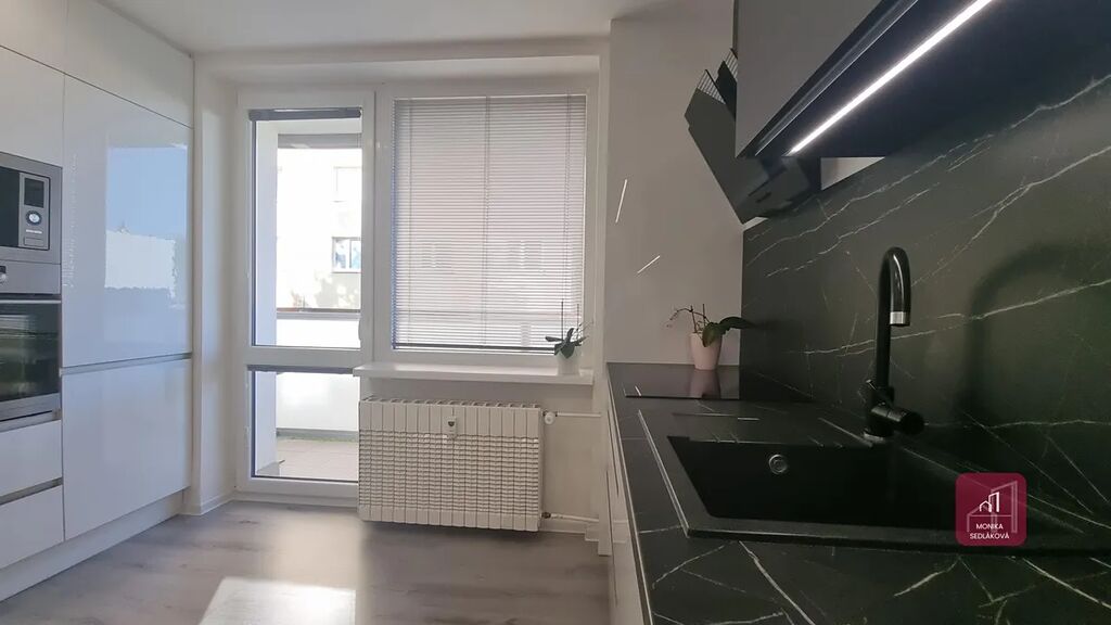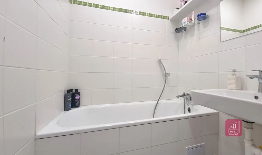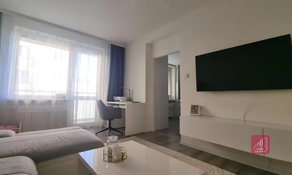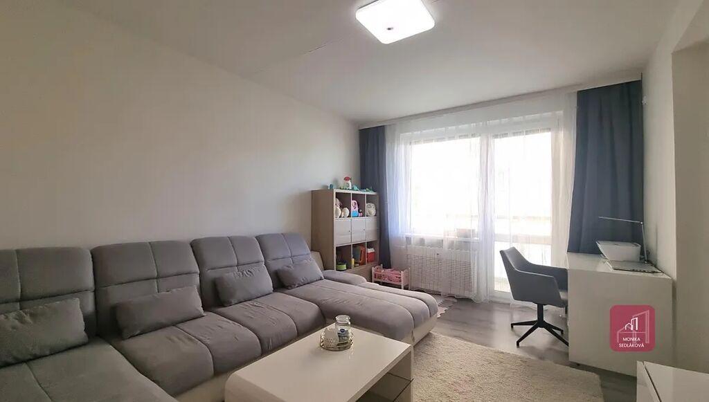 Byt je orientovaný na východ a nabízí se částečně vybavený. Zůstává moderní kuchyňská linka se spotřebiči, jídelní stůl se židlemi, kompletní šatna s vestavěnou skříní, regály a komoda v obývacím pokoji.