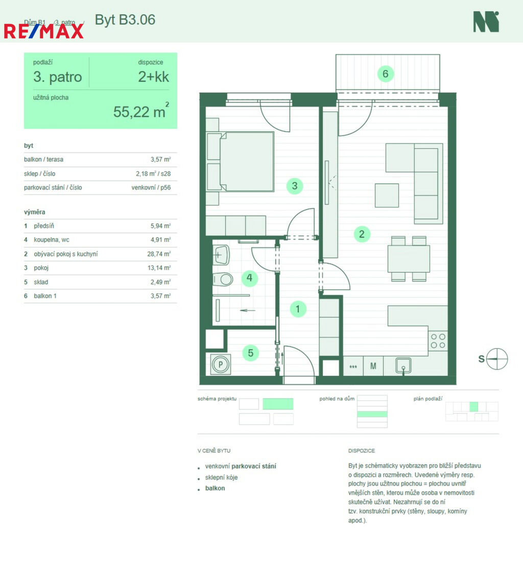 Nabízený byt B3.06 s dispozicí 2kk se nachází ve 3.nadzemním podlaží budovy B1. Užitná plocha samotného bytu je 55,22 m2 plus balkon o celkové výměře 3,57 m2 plus 2,18 m2 sklepní prostory. Součástí ceny je i výhradní vnější parkovací stání.