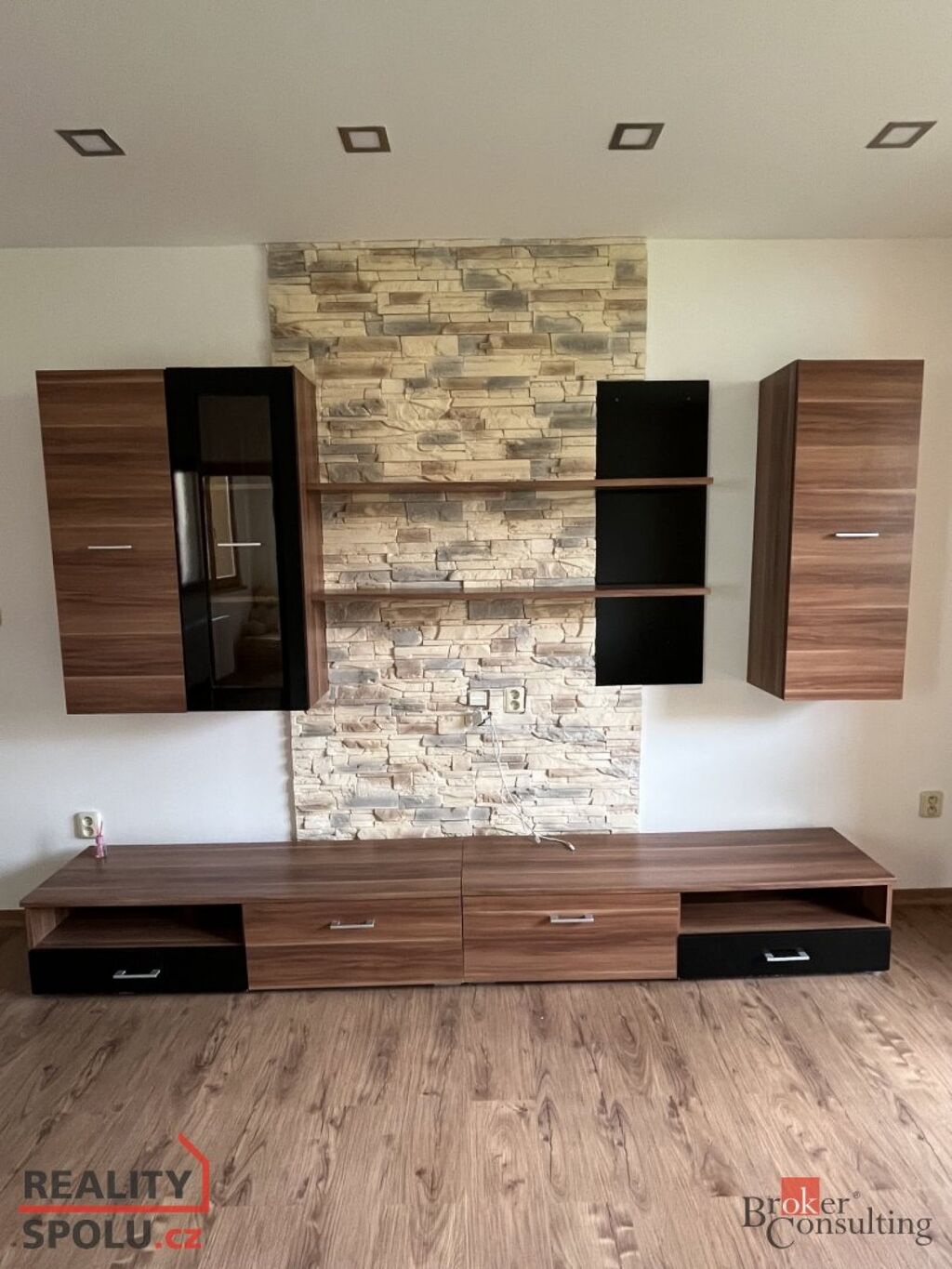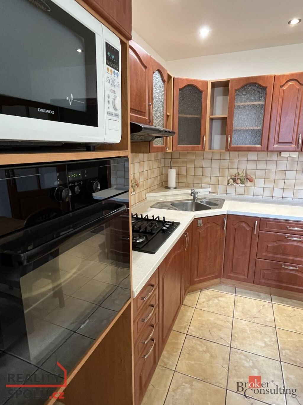 Součástí vybavení je kuchyňská linka s plynovým sporákem, troubou, digestoří, mikrovlnnou troubou a jídelním setem. V obývacím pokoji zůstává obývací stěna.