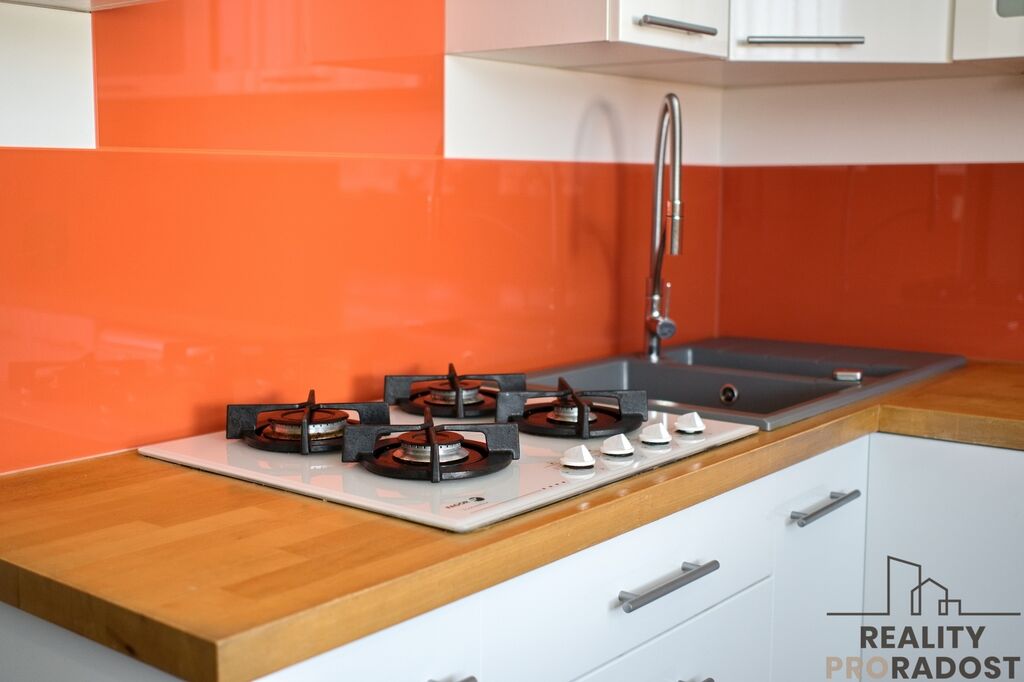 Kuchyňská linka do L kombinuje dekory lesklé bílé a pracovní desky z masivu. Součástí linky jsou i vestavěné spotřebiče - myčka, plynová varná deska, odsavač par, trouba, mikrovlnná trouba a granitový dřez s baterií. V kuchyni je dostatek prostoru na umístění jídelního stolu. Kuchyně je orientována do vnitrobloku do zeleně.