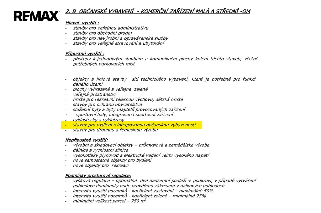 Dle územního plánu je pozemek zařazen do plochy „komerční zařízení malá a střední“, což umožňuje výstavbu provozovny s bydlením majitele, nebo stavby pro bydlení s integrovanou občanskou vybaveností. Využití je tak vhodné jak pro podnikání, tak pro kombinaci s rodinným bydlením.