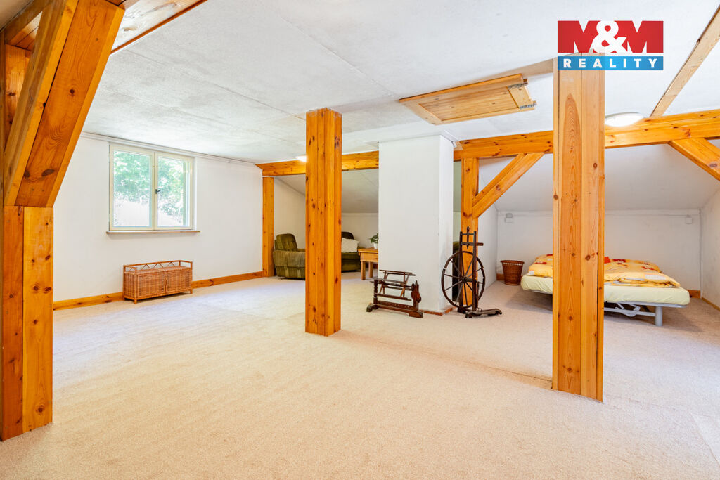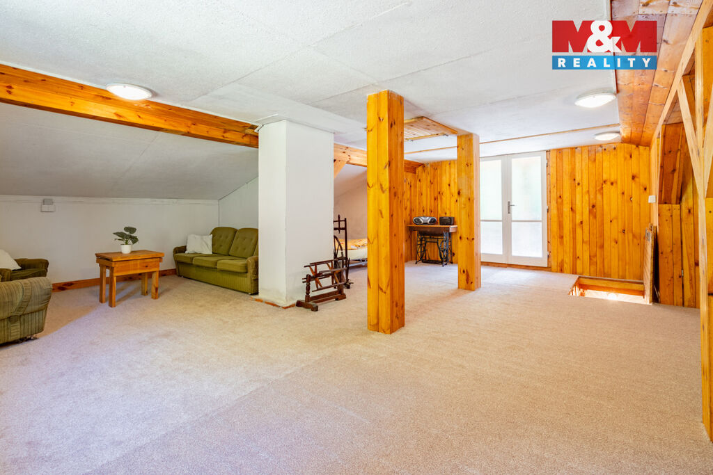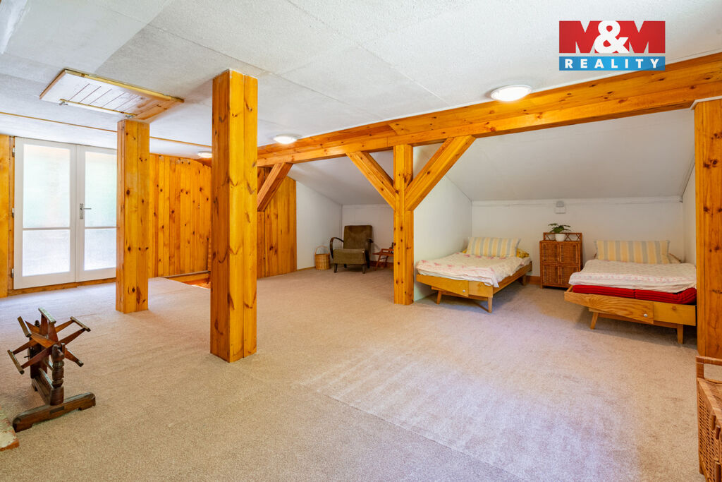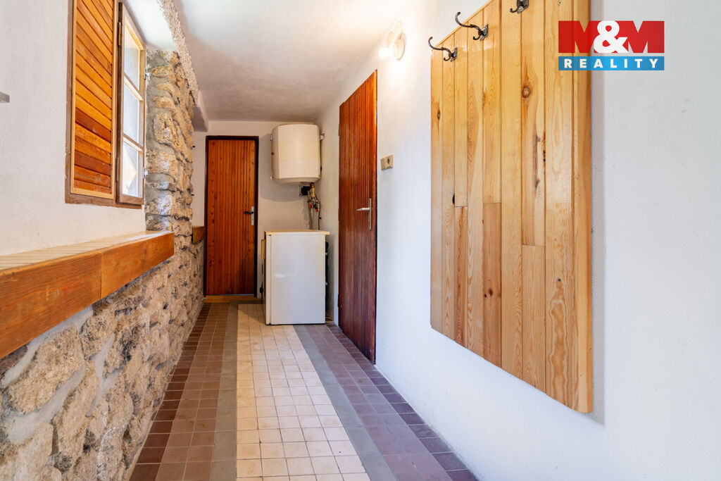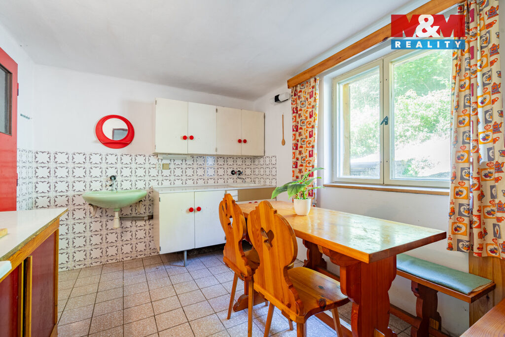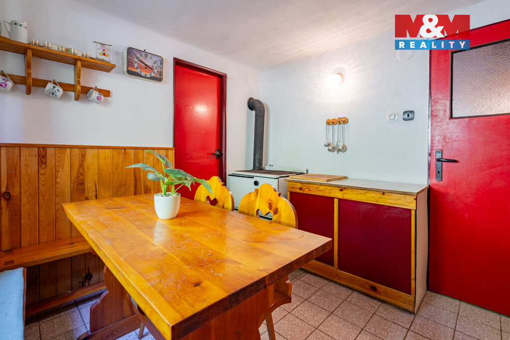 Dispozičně je dům řešen do dvou nadzemních podlaží – v přízemí se nachází kuchyně, koupelna a menší pokoj, zatímco podkroví nabízí útulný obývací prostor s vymezenými zónami pro spaní. Nemovitost je v dobrém technickém stavu, což umožňuje okamžité využívání, případně rekonstrukci dle vlastních představ. Lokalita je velmi tichá a poskytuje ideální prostředí pro relaxaci mimo ruch města.