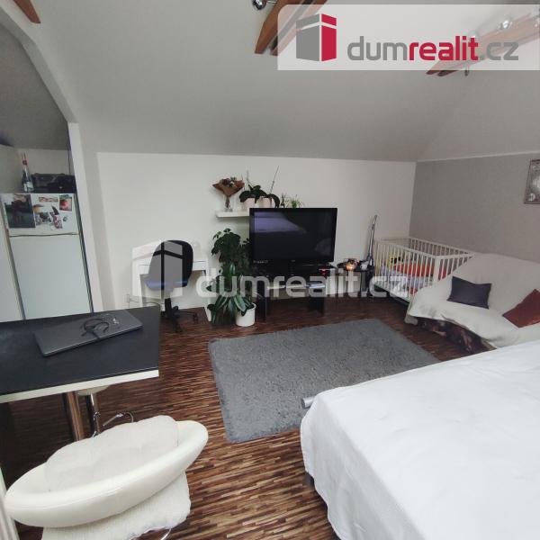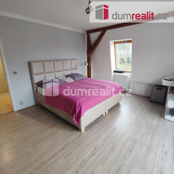Po dřevěném schodišti se dále dostanete do druhého patra domu, kde se rozkládá samostatný byt o velikosti 4+0 s vlastní koupelnou.
