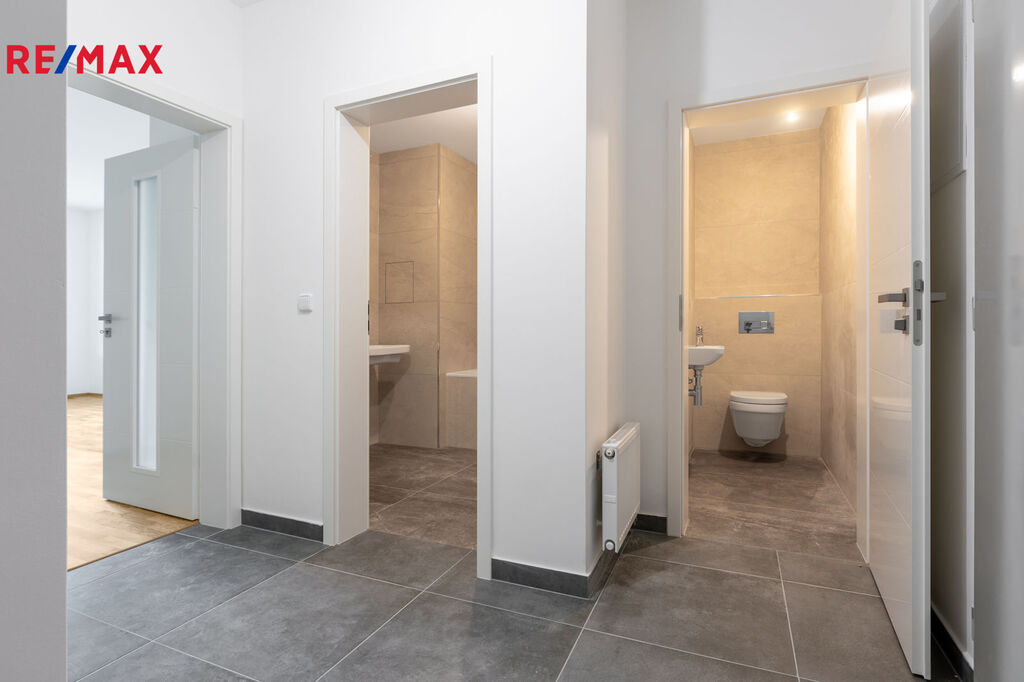 Byt je standardně vybaven kvalitní dřevěnou podlahou a v koupelně a na WC velkoformátovou moderní dlažbou. Pokud si chcete interiér přizpůsobit svému vkusu, developer Vám nabízí možnost volby finálních materiálů.