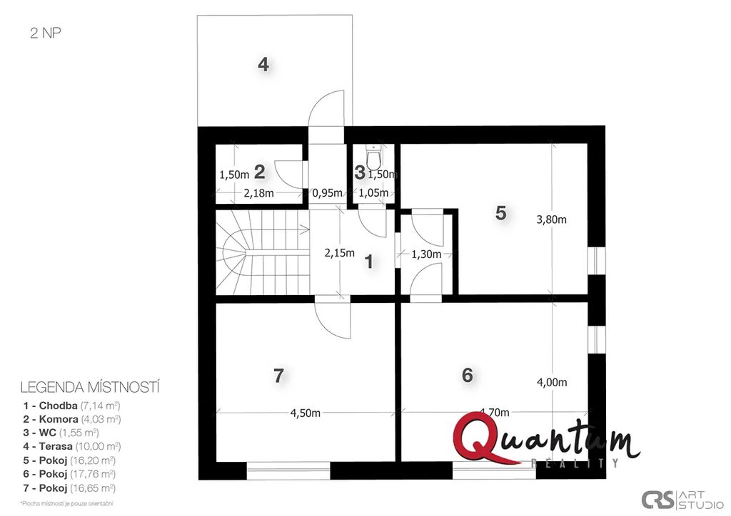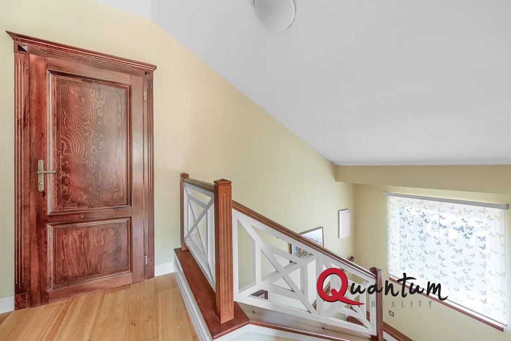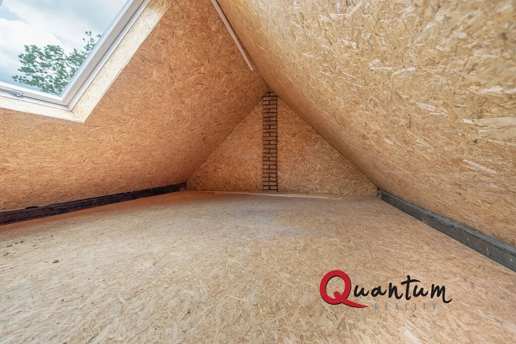 Dřevěné schodiště vede do 2. podlaží, kde jsou dva světlé dětské pokoje, ložnice, toaleta, komora a chodba s přístupem na druhou terasu s výhledem do zahrady. Nad tímto podlažím se nachází kvalitně zpracovaná půda vhodná k uskladnění věcí (není započítána do celkové plochy).