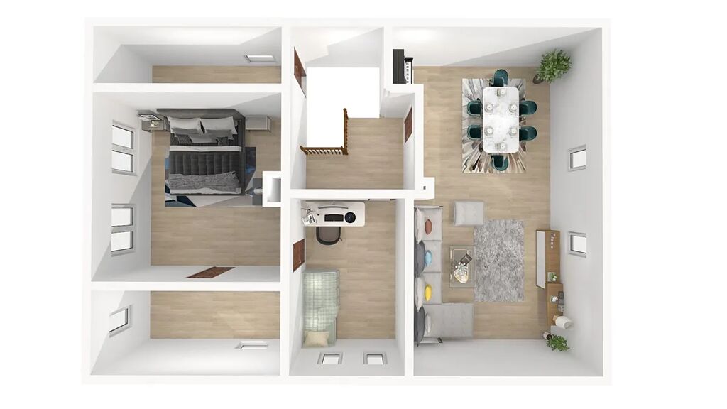 Dispozičně je nemovitost řešena jako 6+1, kdy v přízemí nalezneme prostornou chodbu, také je zde obývací pokoj ze kterého je vstup do kuchyně, další neprůchozí pokoj a také koupelna se sprchovým koutem a oddělená toaleta.