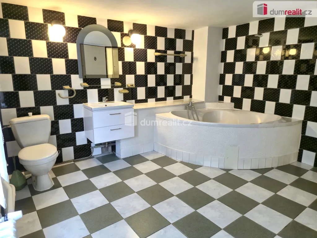 Při stoupání po dominantní schodišti v pravé části stavby, mineme koupelnu v prvním patře, s rohovou vanou, umyvadlem a WC, s dostatkem prostoru na pračku a sušičku.