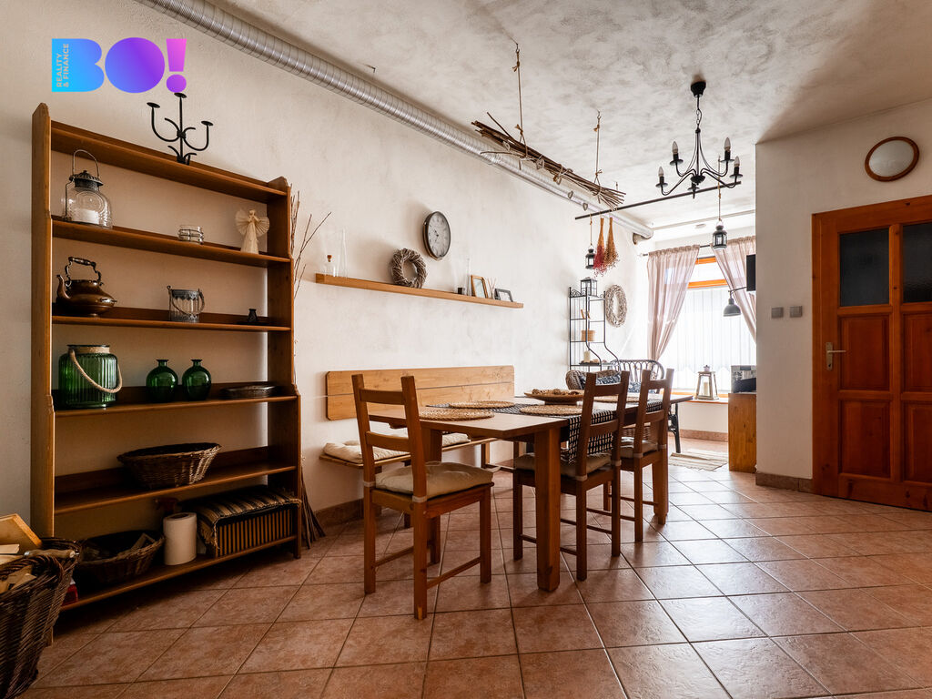 1.NP - předsíň, velká a prostorná jídelna, kuchyně s vestavěnými spotřebiči, vstup na krytou terasu.