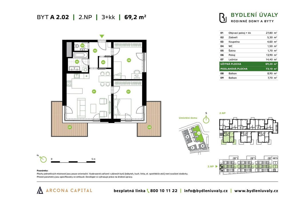 Nabízíme Vám byt 3+kk 73,10 m² se dvěma balkony 8,90 m² a 7,70 m², šatnou, koupelnou a samostatným WC v projektu Bydlení Úvaly. Byt se nachází ve 2. podlaží bytového domu A.
