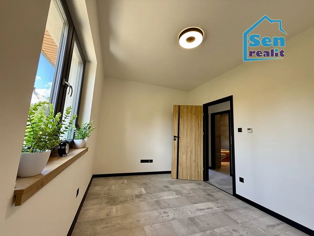 Plovoucí podlaha, stropní světlo s možností volby intenzity jasu, dřevěný parapet, podsvícený lamelový panel