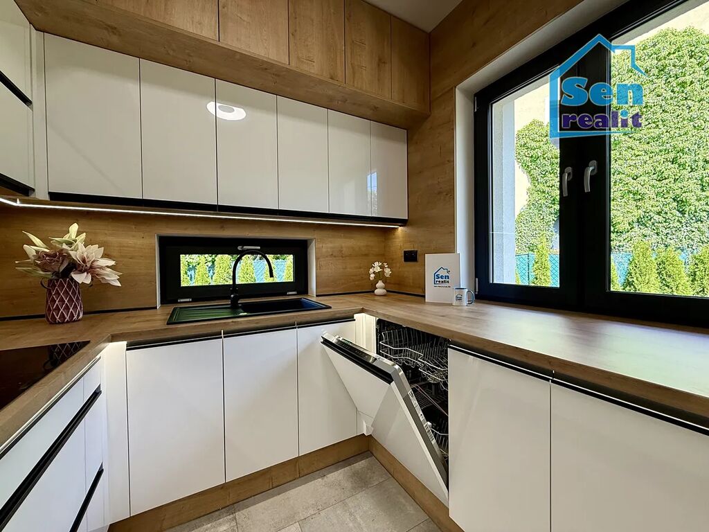 Plovoucí podlahy, stropní světla s možností volby intenzity jasu, dveře v dekoru dřeva, dřevěné parapety