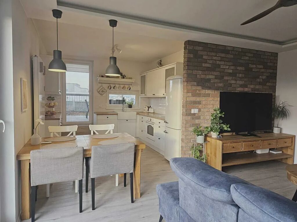 Prostorný obývací pokoj propojený s kuchyní a jídelnou, se vstupem na balkon i na střešní terasu