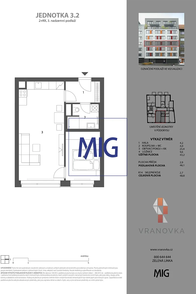 Nabízená jednotka má plochu 46,1 m2 a náleží k ní sklep o velikosti 2,7 m2.