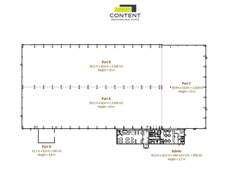 - lze dělit na samostatné jednotky od cca 1600 m²,