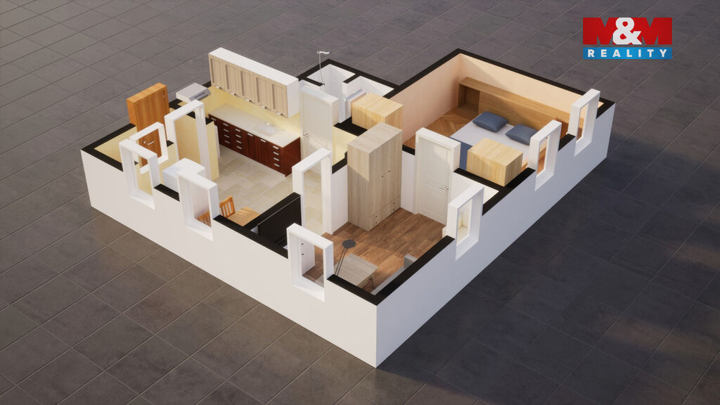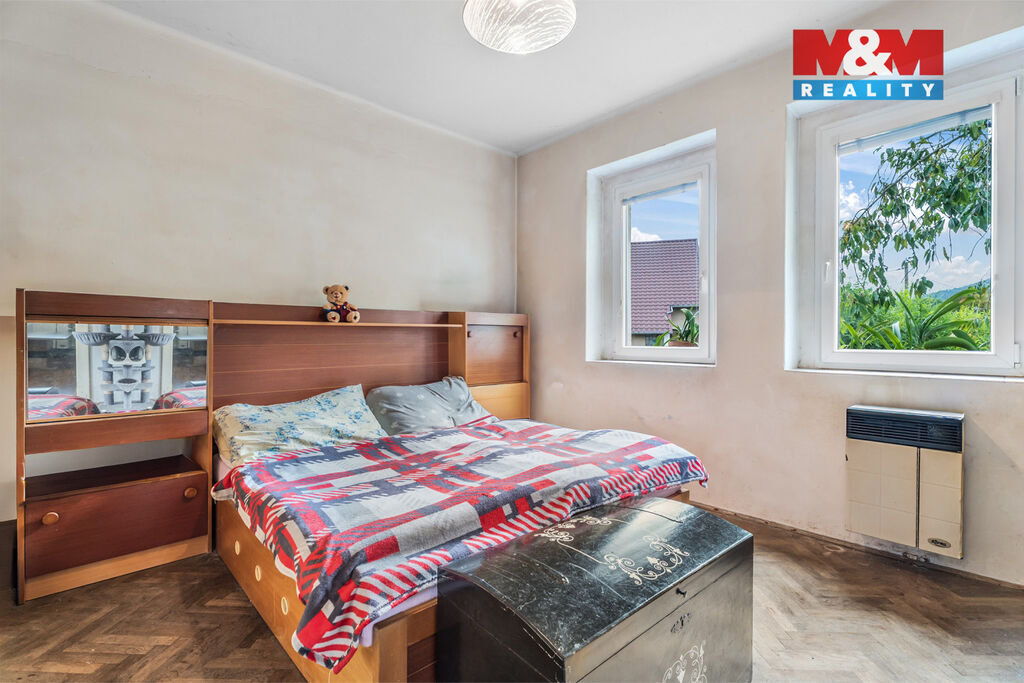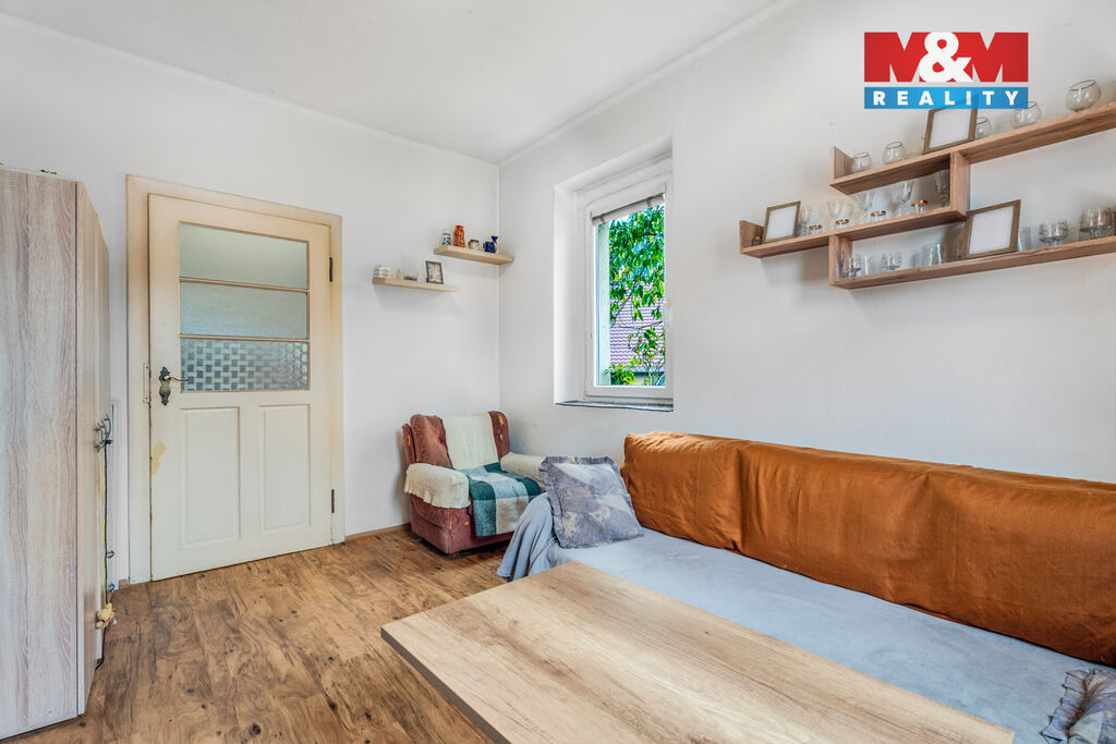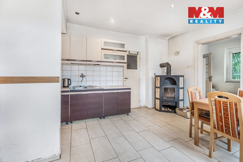 Dispozice zahrnuje dva na sebe navazující pokoje, kuchyň a koupelnu. K dispozici je i zahrada kolem domu.