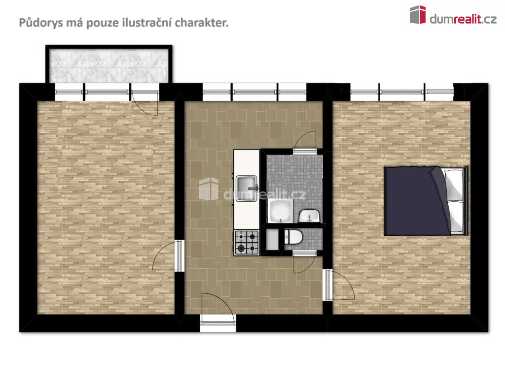 Byt prošel v nedávné době kompletní revitalizací a nabízí se k pronájmu bez vybavení/nábytku. Sestává z otevřené chodby, kuchyně s moderní linkou s prostorem pro jídelní stůl, koupelny se sprchovým koutem, umyvadlem s místem pro pračku a dále ze dvou neprůchozích pokojů o cca 20 m², kde z obýváku je přístup na balkon.