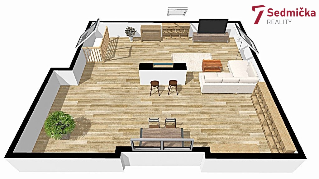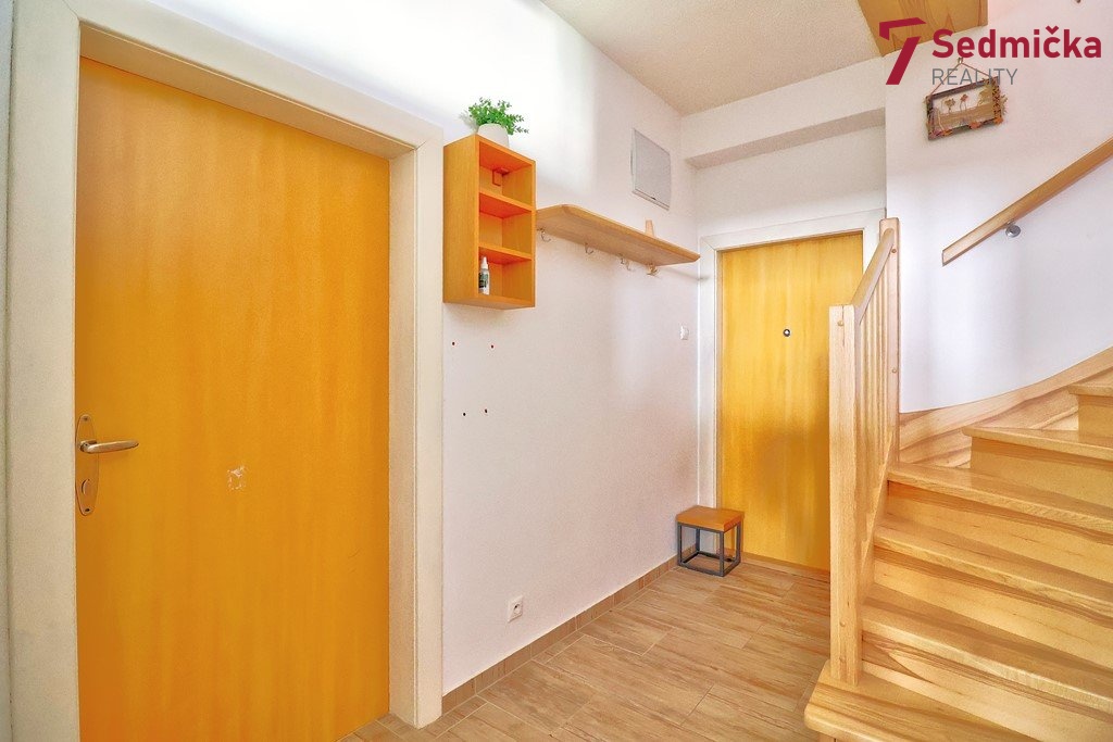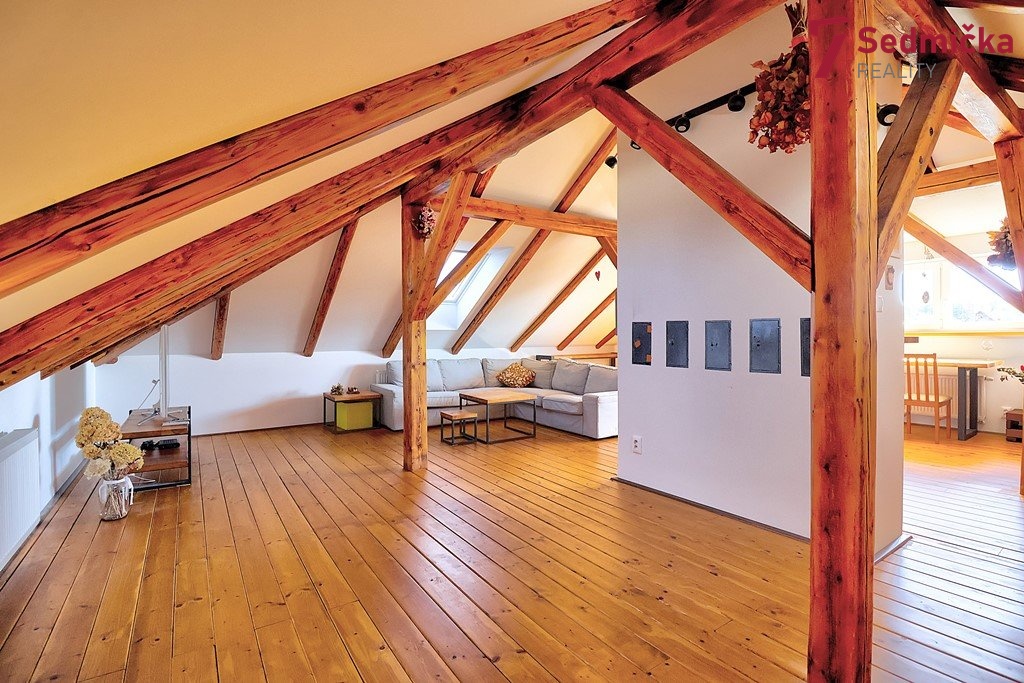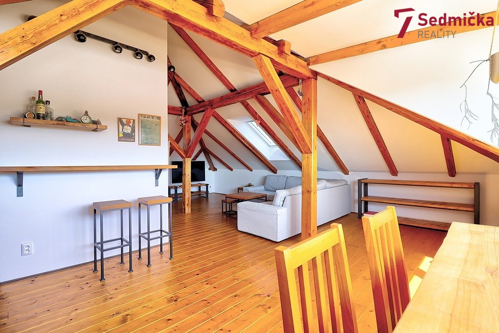 Byt je v 3. NP bytového domu se třemi byty. Má prostornou předsíň, kuchyň s jídelním koutem, dva pokoje, balkón, koupelnu s WC a v podkroví je velká jednoprostorová místnost.