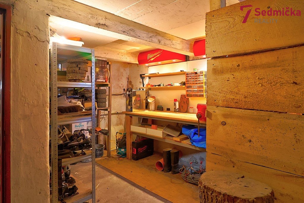 K bytu patří sklep, 1/3 společného sklepa, zahrada s dřevníkem, 2 parkovací místa, pergola s elektřinou, vodou, odpadem a kamny, majitel může navíc využívat 2 horní podesty na schodišti.