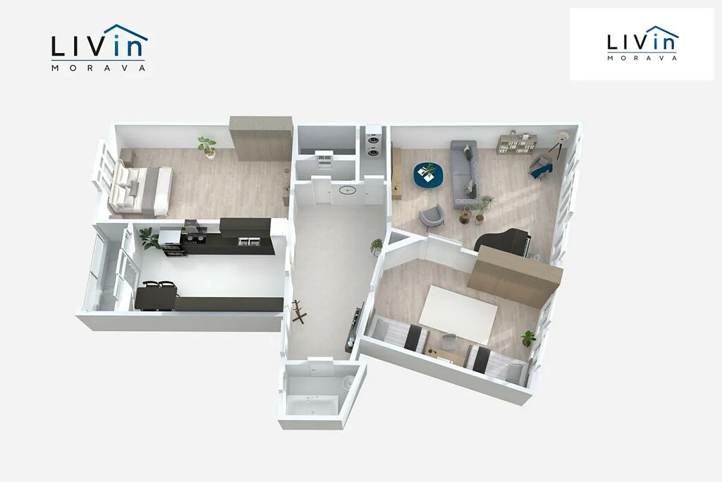 Díky nadstandardní podlahové ploše 131 m² je možné byt upravit také na dispozici 4+kk — přesunutím kuchyňské linky do obývacího pokoje o velikosti 35 m², který nabízí dostatek prostoru pro plnohodnotný kuchyňský kout. Přípojky vody a odpad jsou umístěny v sousední místnosti s pračkou, takže napojení je technicky snadné. Tímto řešením lze získat další ložnici nebo dětský pokoj s balkonem orientovaným do vnitrobloku.