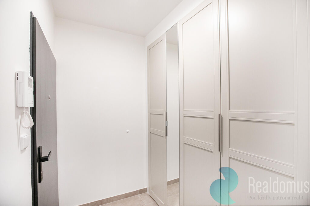 bytu se nacházíte v zádveří s vestavnými skříněmi, které poskytují dostatek úložného