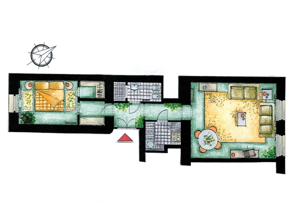 Byt o celkové ploše 55m2 je plně vybaven nábytkem. Kuchyň je vybavena kuchyňskou linkou se spotřebiči. V bytě je prostorný obývací pokoj/jídelna se stolem a židlemi, velkou rozkládací pohovkou, TV s satelitem. Dále je v bytě ložnice s manželskou postelí, vestavěnou skříní a šatnou. Koupelna se sprchou, umyvadlem, bidetem a toaletou.