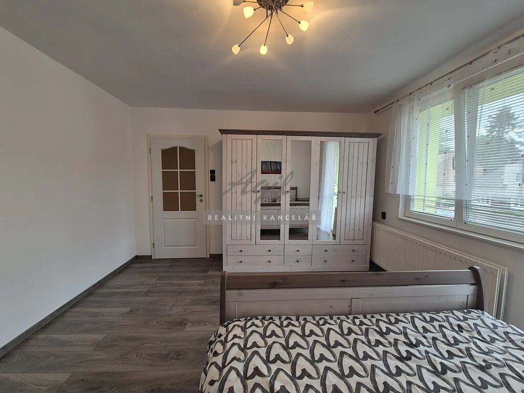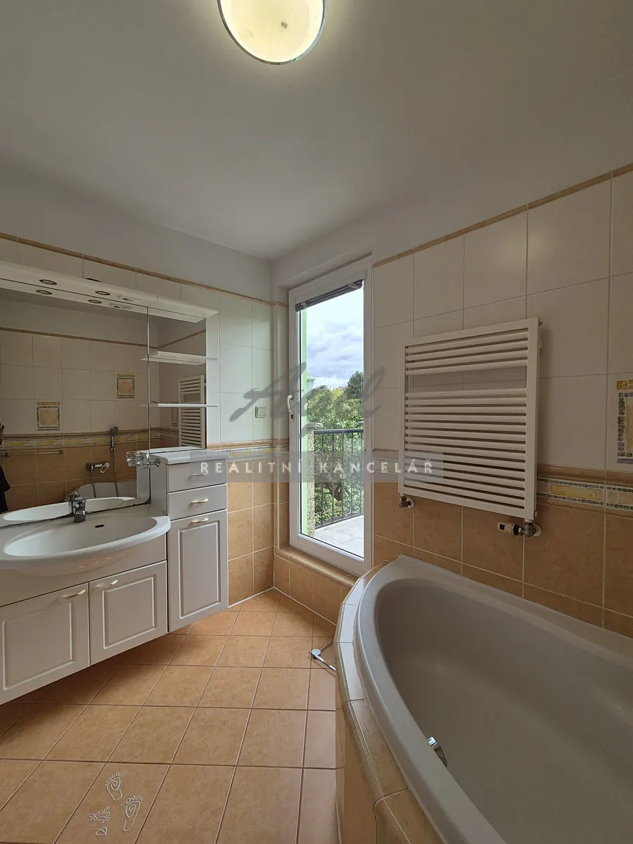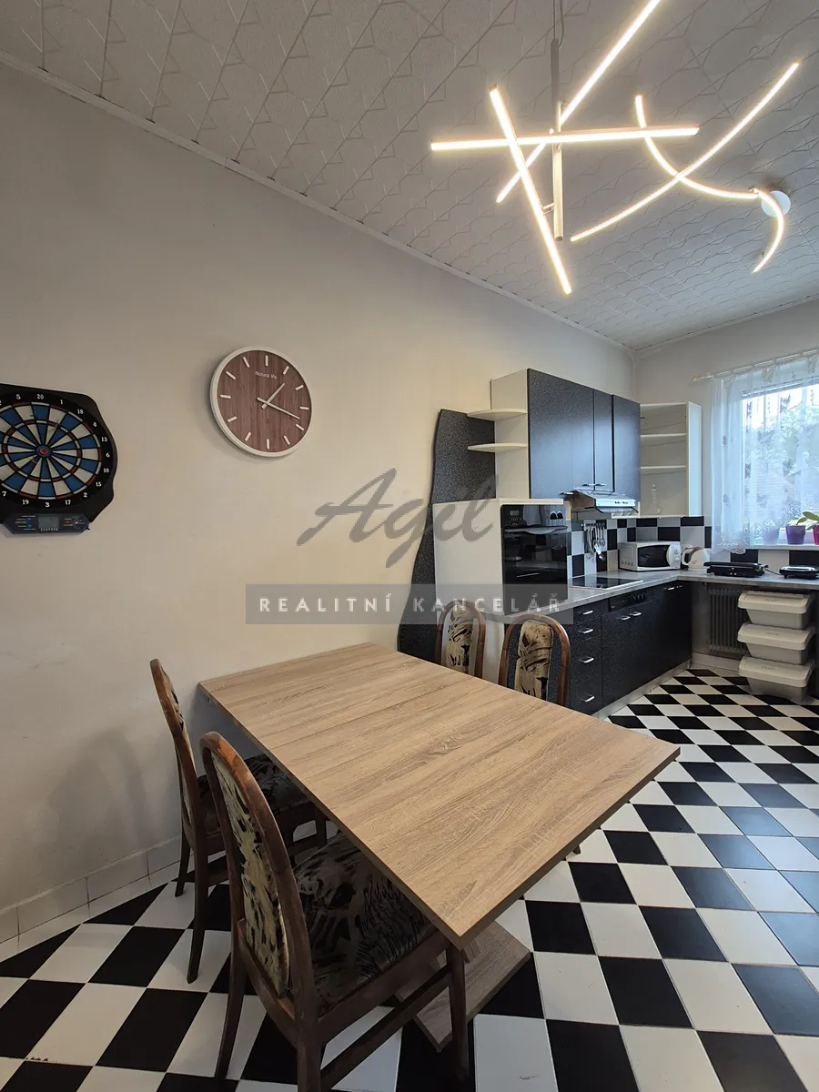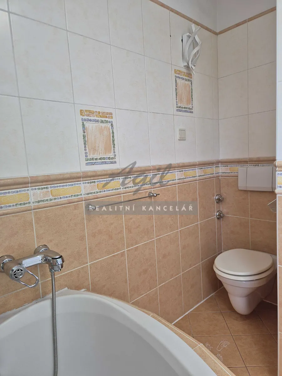 Vstupní chodba společná s majiteli domu, samostatné schodiště do patra, kuchyně s posezením, dětský pokoj, chodba, koupelna s vanou a s WC dohromady a se vstupem na terasu, která je situována do zahrady, terasa, obývací pokoj, ložnice s balkone do ulice, dětský pokoj a 2x venkovní stání před domem.