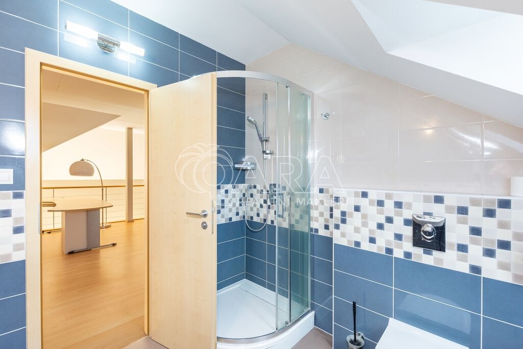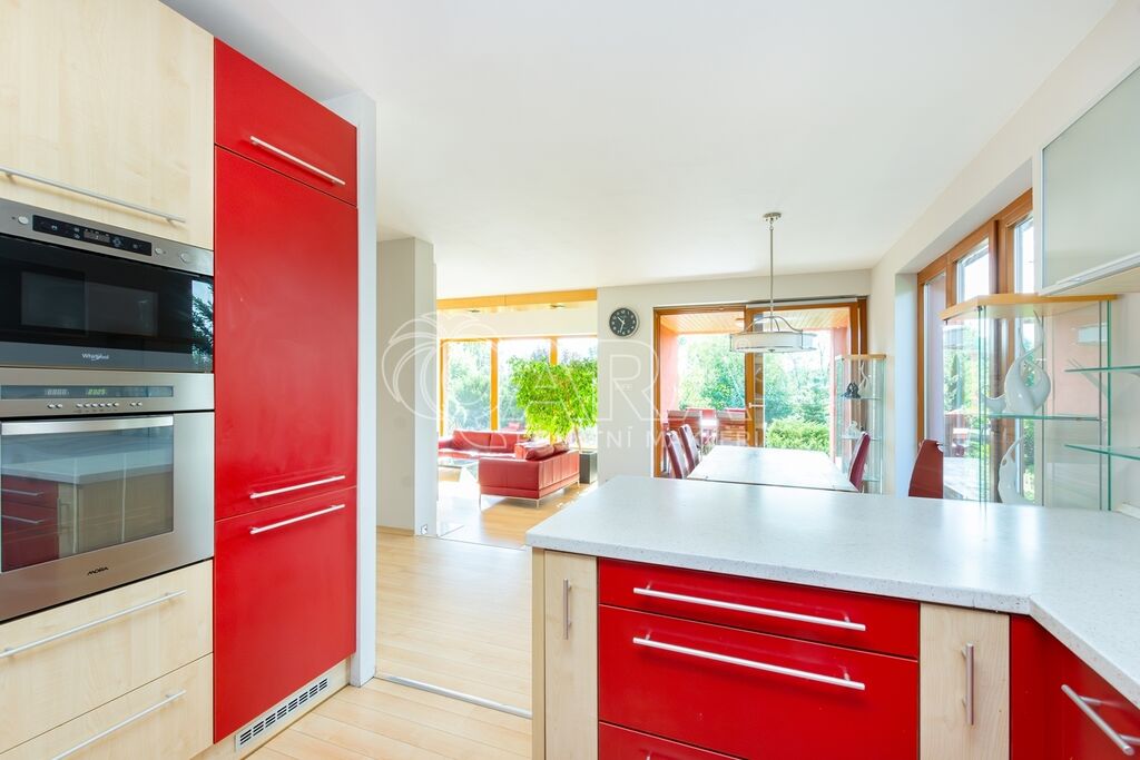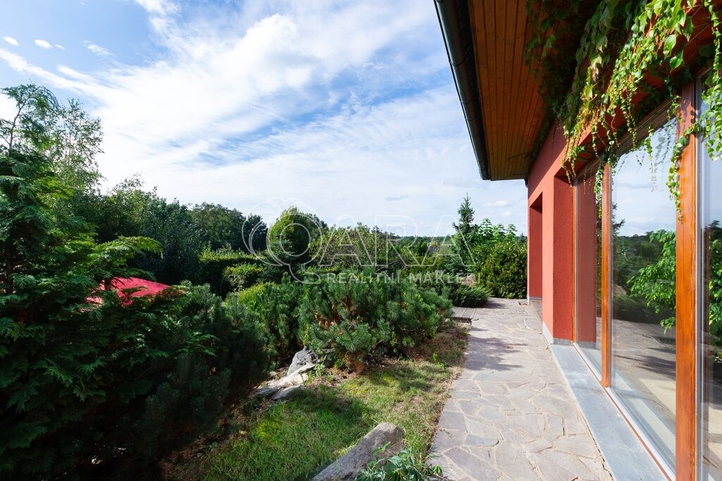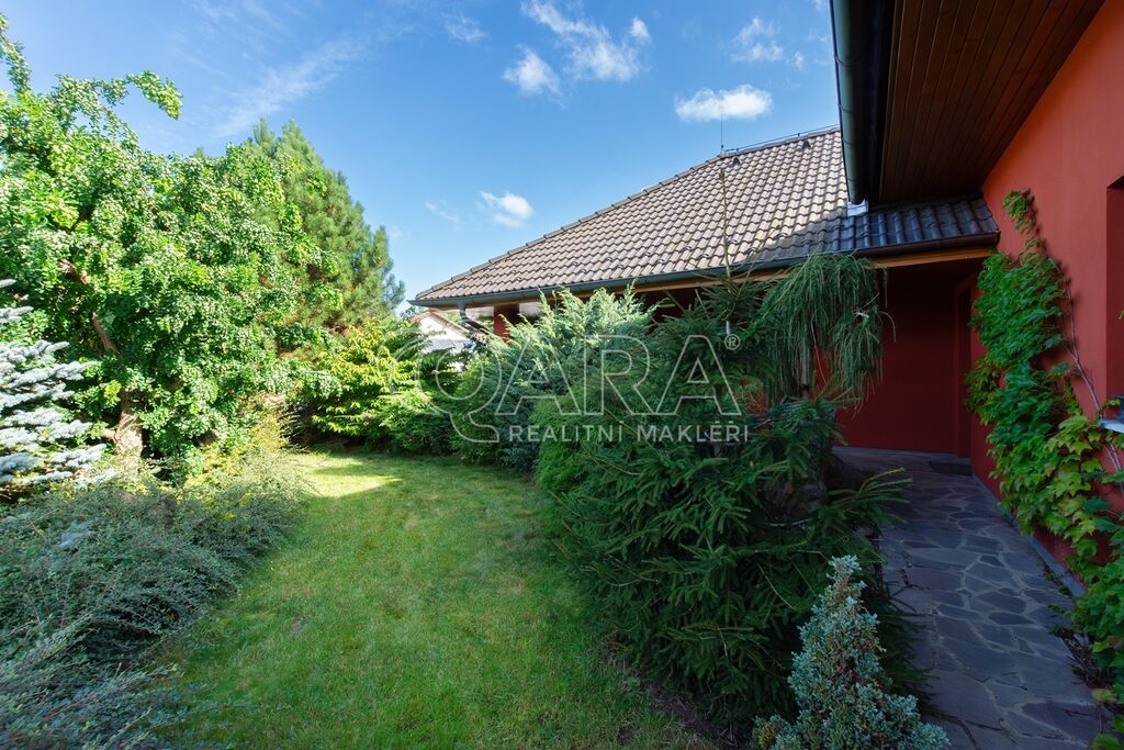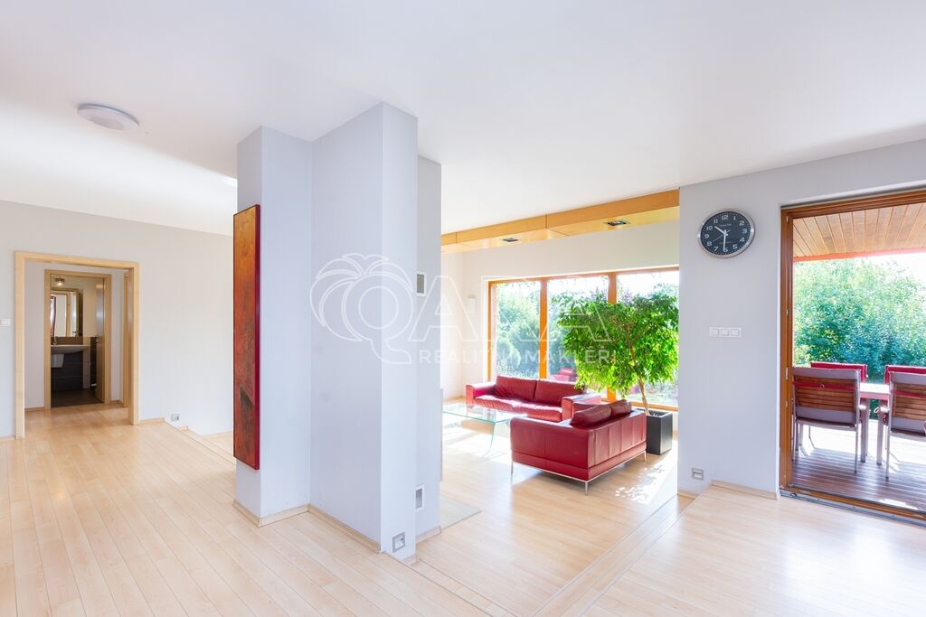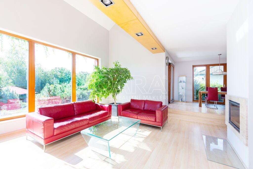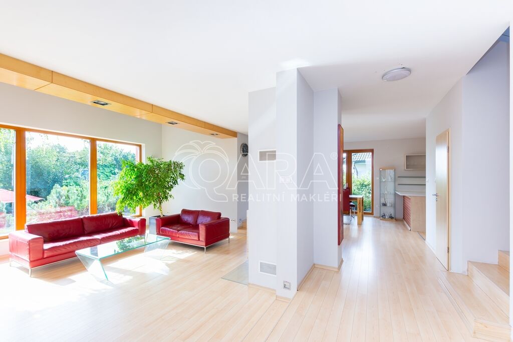 Dům byl navržen architektem tak, aby poskytoval maximální komfort a velkorysý prostor pro společné chvíle rodiny. Prostorné přízemí nabízí otevřený obývací pokoj s krbem, jídelnu a pracovnu s přímým výhledem do zahrady – ideální místo pro setkávání a odpočinek. Společný prostor je rozšířen o otevřenou galerii v horním patře, využitelnou jako další pracovna či herna. V patře najde každý člen rodiny svůj vlastní klidný prostor pro odpočinek či tvůrčí činnost. Hlavní ložnice typu en suite je propojena s koupelnou a šatnou, čímž vytváří dokonalé soukromí a komfort.