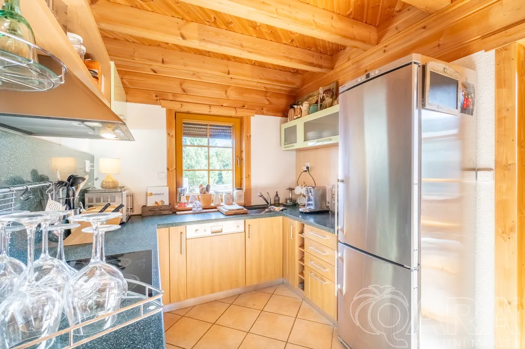 Atmosféru domova podtrhuje krb v obývacím pokoji i venkovní terasa, která zve k posezení a odpočinku, ať už s ranní kávou či po návratu ze sjezdovky.