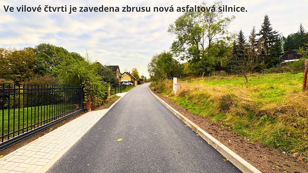 Vilovou čtvrť spojuje nová asfaltová silnice. Na pozemku je nová studna, přípojka elektřiny a povolení na čističku odpadních vod (platné do r. 2030, zahrnuto v ceně).