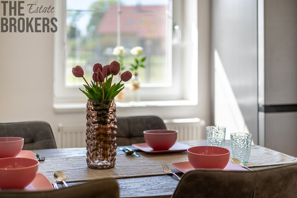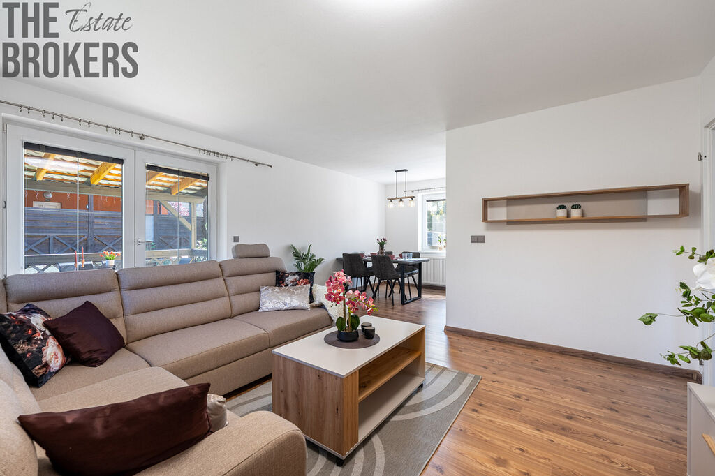 Při vstupu do domu vás přivítá útulná vstupní místnost, která navazuje na chodbu. Odtud se otevírá srdce celé domácnosti – prostorný obývací pokoj propojený s kuchyní s novými spotřebiči. Je to místo, kde se potkává rodina, kde se tvoří vzpomínky a kde vás denně zahřeje nejen teplo domova, ale i atmosféra tohoto prostoru. Z obývacího pokoje se přímo vychází na krytou terasu o velikosti 15 m², která poskytuje nádherný výhled do zahrady a stává se přirozeným prodloužením obytného prostoru. Terasa je ideálním místem pro letní snídaně, večerní posezení s přáteli či chvíle klidu s knihou v ruce.