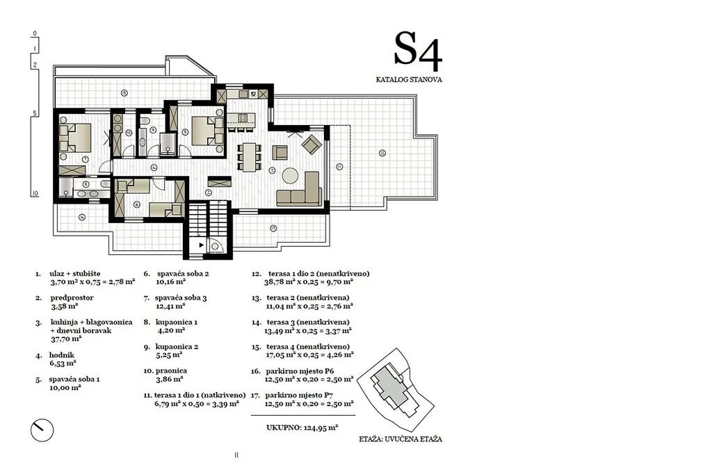 Apartmán S4 o ploše 124,95 m2, který zabírá celé druhé patro malé budovy, sestává z chodby, 2 koupelen, prádelny, 3 ložnic, z nichž jedna má vlastní koupelnu, se vstupem na 2 terasy, z prostorného obývacího pokoje s kuchyní, jídelny s přístupem na další 2 velké terasy o rozloze 45,57 m2 a 11,04 m2. Všechny 4 terasy nabízejí otevřený výhled na moře a město Murter. K apartmánu náleží 2 venkovní parkovací místa. Apartmán je vybaven bezpečnostními dveřmi, klimatizací ve všech pokojích, elektrickými roletami a moskytiérami.