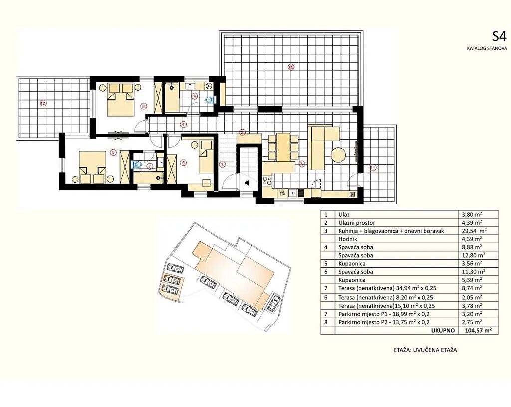 Apartmán S4 o ploše 104,57 m2, který zabírá celé druhé patro malé budovy, sestává z chodby, 2 koupelen, 3 ložnic, z nichž jedna má vlastní koupelnu, se vstupem na terasu, z prostorného obývacího pokoje s kuchyní, jídelny s přístupem na 2 velké terasy o rozloze 34,94 m2 a 8,20 m2. Všechny 3 terasy nabízejí otevřený výhled na moře a město Murter. K apartmánu náleží 2 venkovní parkovací místa. Apartmán je vybaven bezpečnostními dveřmi, klimatizací ve všech pokojích, elektrickými roletami a moskytiérami.