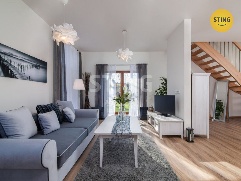 V přízemí domu se nachází otevřené zádveří, samostatné WC, hala pod schodištěm, kuchyň s jídelním koutem a obývací pokoj, odkud se francouzskými dveřmi dostanete rovnou na zahradu do klidové části za domem. Otevřený prostor v přízemí umocňuje v protilehlém rohu jídelního koutu dřevěné schodiště, které vede z haly do prvního patra. Zde se v takzvané klidové části nachází centrální prostorná chodba, odkud můžete vejít do tří samostatných, neprůchozích pokojů a také do koupelny, která disponuje rohovou vanou, sprchovacím koutem a WC. Z této chodby se rovněž dostanete do technické místnosti, kde je umístěn elektrický bojler na ohřev teplé vody a je zde i prostor pro uložení věcí k údržbě a provozu domu. Platba nájemného v měsíci předchozím, 2x kauce, jeden nájem + DPH odměna RK. Platby za elektřinu, vodu, komunální odpad spojené s užíváním domu si řeší nájemce samostatnou smlouvu s dodavateli služeb.