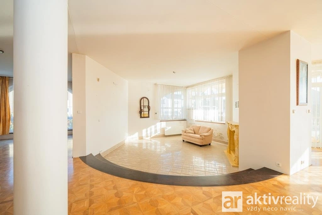 Suterén (343 m²): Zde je velký prosklený bazén s protiproudem, vířivka pro 6 osob, sauna, tělocvična, prádelna a technické zázemí.