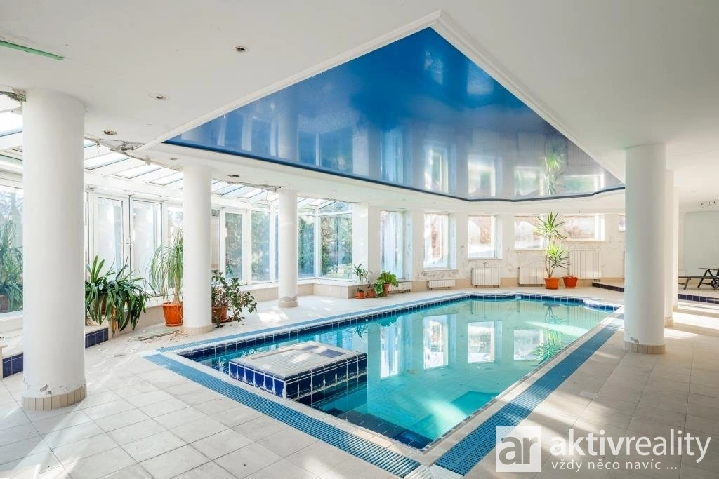 Suterén (343 m²): Zde je velký prosklený bazén s protiproudem, vířivka pro 6 osob, sauna, tělocvična, prádelna a technické zázemí.