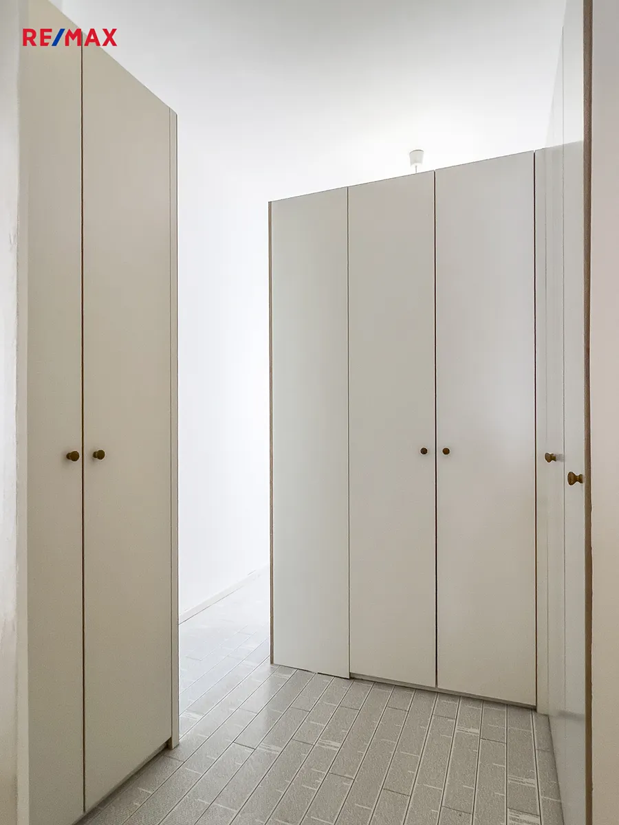 Úložné prostory jsou řešeny vestavěnými skříněmi.