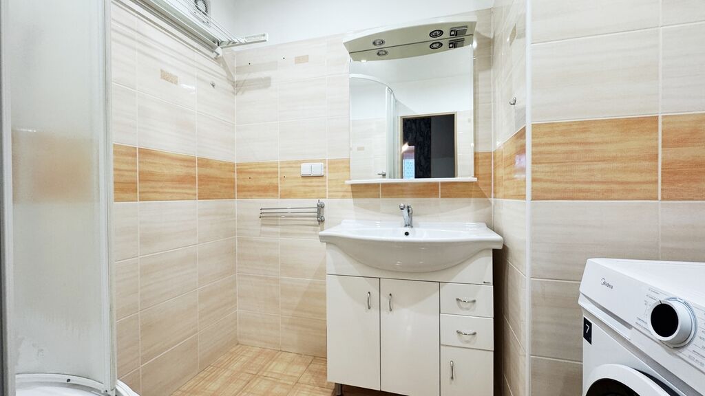 Jednotka prošla částečnou rekonstrukcí. Jsou zde plastová okna se žaluziemi, v obývacím pokoji a jedné ložnici je nová plovoucí podlaha, v chodbě a druhé ložnici kvalitní nové lino. Byt má zděné jádro a nové rozvody. Kuchyně je nadstandardně prostorná a vybavená plynovým sporákem, elektrickou troubou, myčkou, lednicí a pračkou; v jídelní části je stůl a čtyři židle. V kuchyni i obývacím pokoji jsou instalovány venkovní rolety na motor, které zvyšují komfort bydlení. Koupelna disponuje sprchovým koutem, v ložnici a v chodbě jsou vestavěné skříně s dostatkem úložného prostoru.
