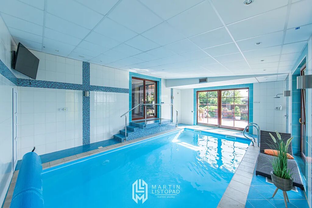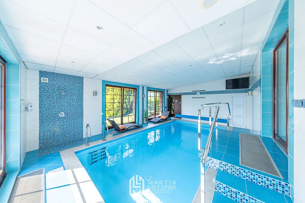 - vnitřní vyhřívaný bazén se saunou (ohřev vody solárními panely a samostatným kotlem)