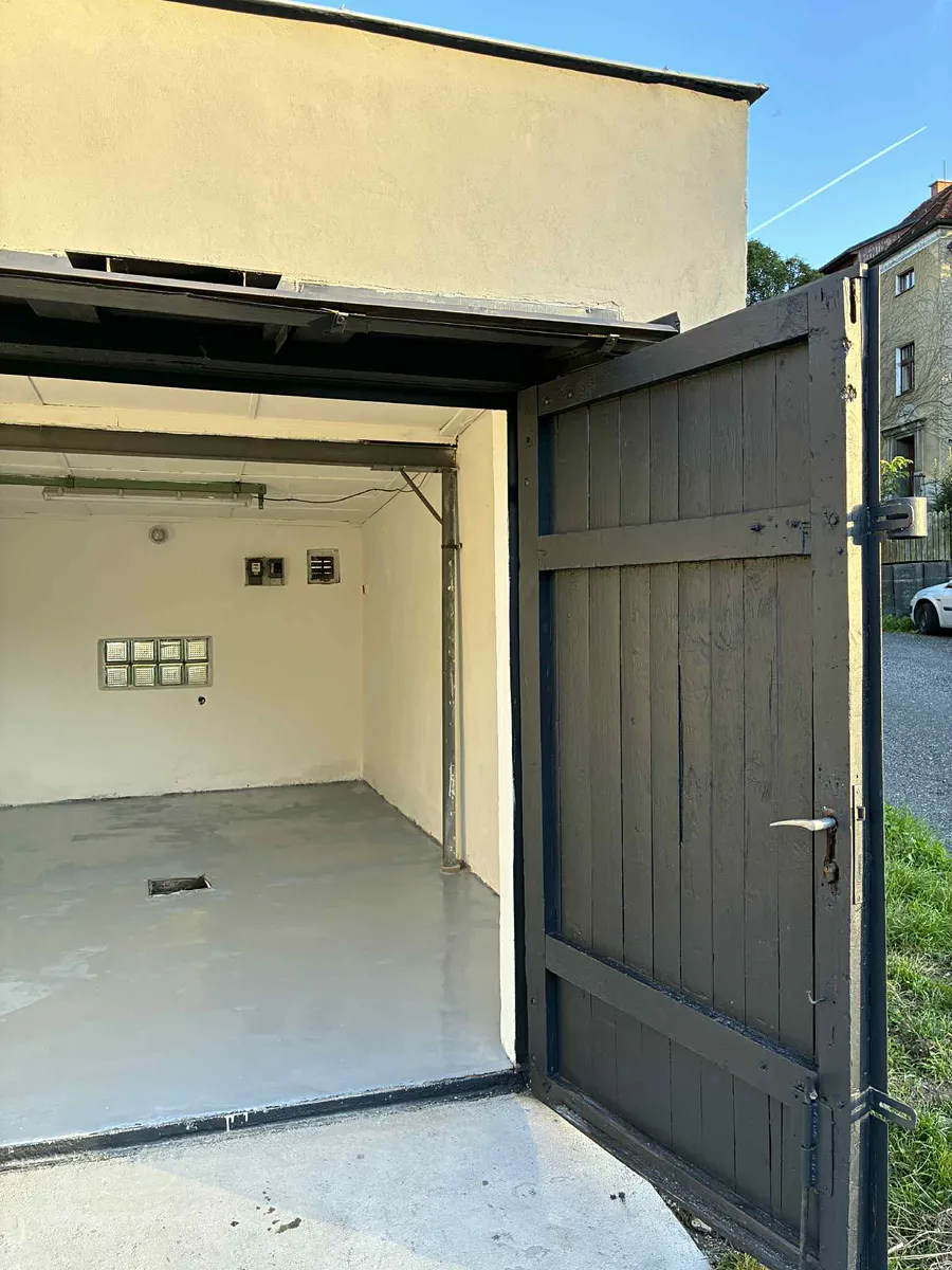 Garáž je po částečné revitalizaci (nově natřená vrata a vnitřní omítky, dále nová podlaha, elektřina, venkovní fasáda garáže, vybetonovaný příjezd ke garáži a částečně opravená střecha).