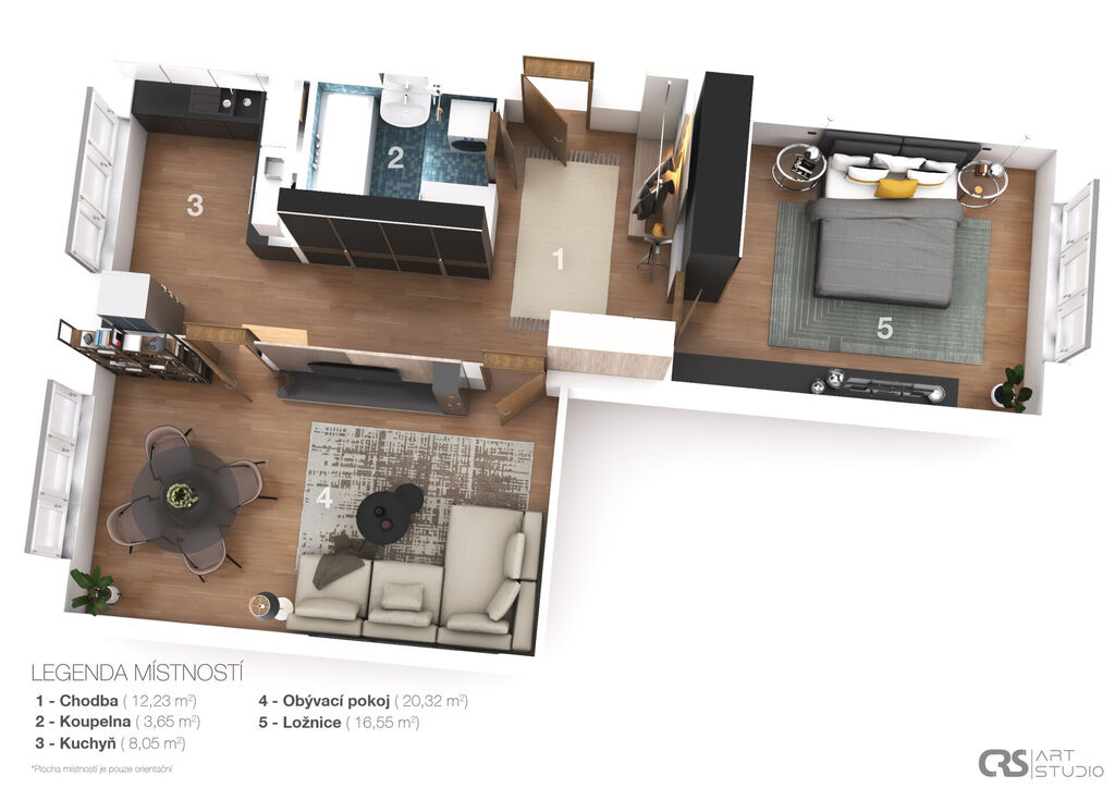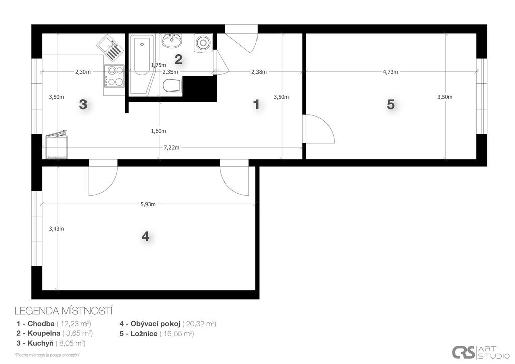 Byt obsahuje velký obývací pokoj, ložnici, samostatnou, plně vybavenou kuchyň, chodbu, koupelnu a wc. Dále je možné využívat společnou lodžii na chodbě domu s druhým bytem. V přízemí je umístěn sklep.