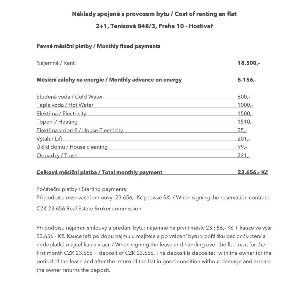 Nájemné je 18.500,- Kč / měsíčně + zálohy na 5.155,- zálohy na energie a služby vč. elektřiny. Přesný rozpis je uveden ve fotografiích u této nabídky.