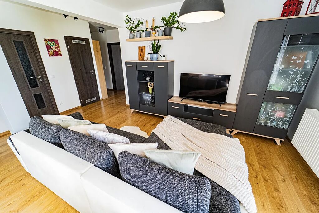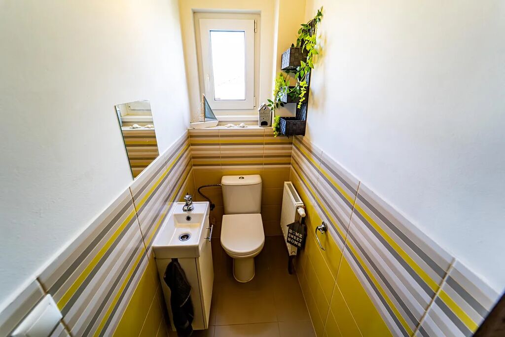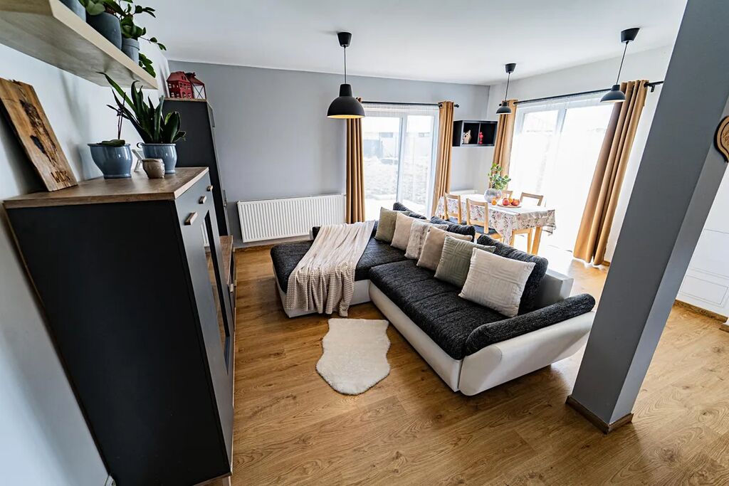 V přízemí se nachází prostorný obývací pokoj propojený s kuchyňským koutem, ložnice, koupelna se sprchovým koutem a vstupní hala. V patře naleznete tři samostatné pokoje, toaletu a koupelnu s vanou.