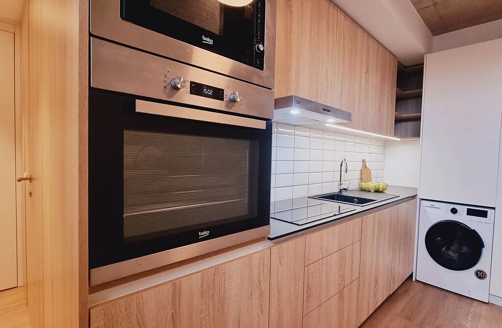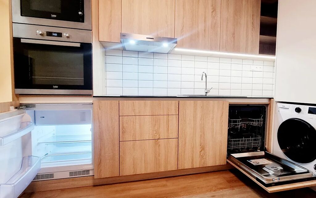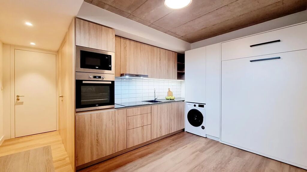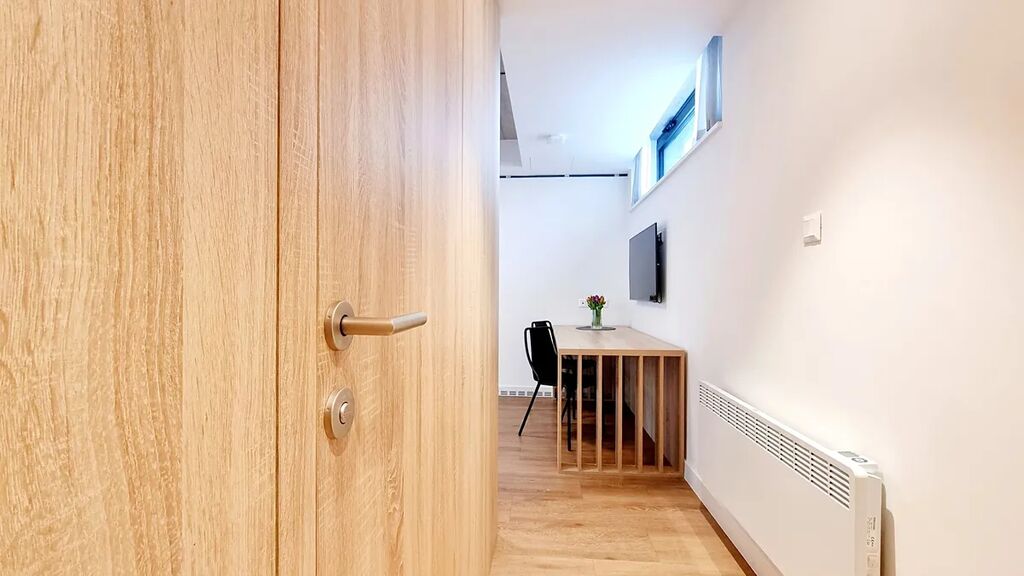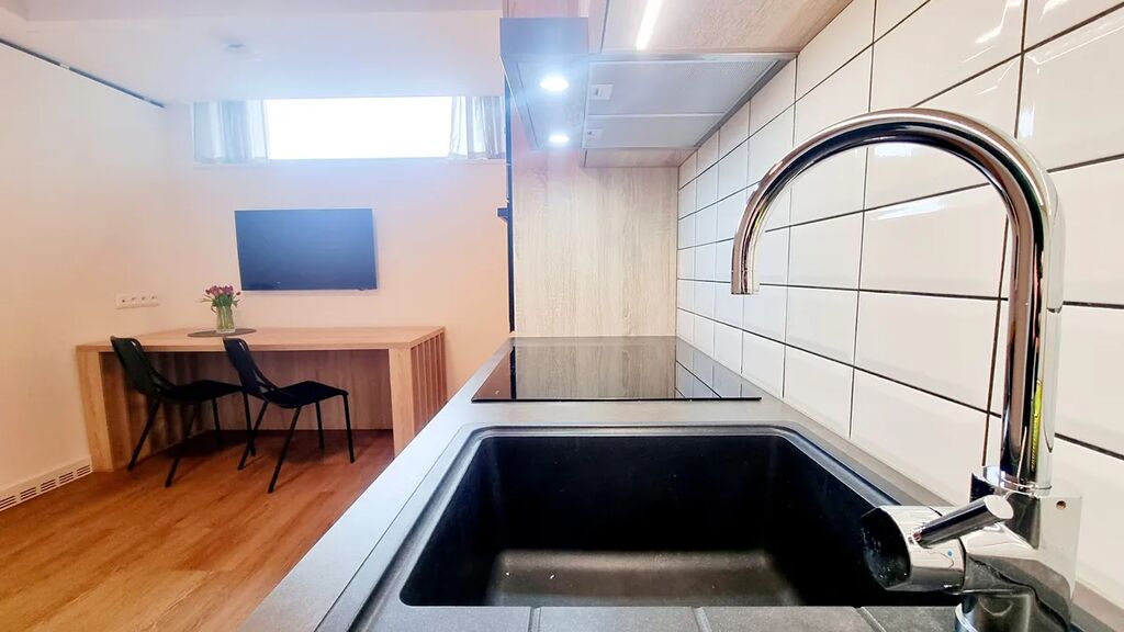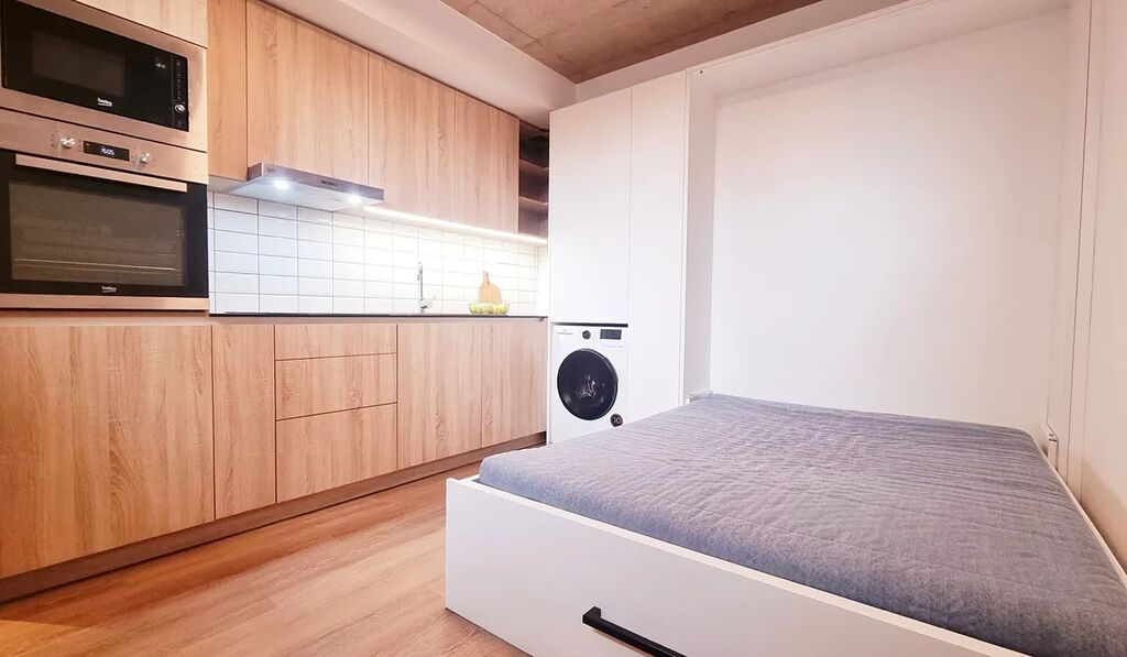Pokoj (17 m²) je vybaven vestavěnou kuchyňskou linkou s lednicí, myčkou, indukční varnou deskou, digestoří, horkovzdušnou troubou, mikrovlnkou a pračkou se sušičkou.