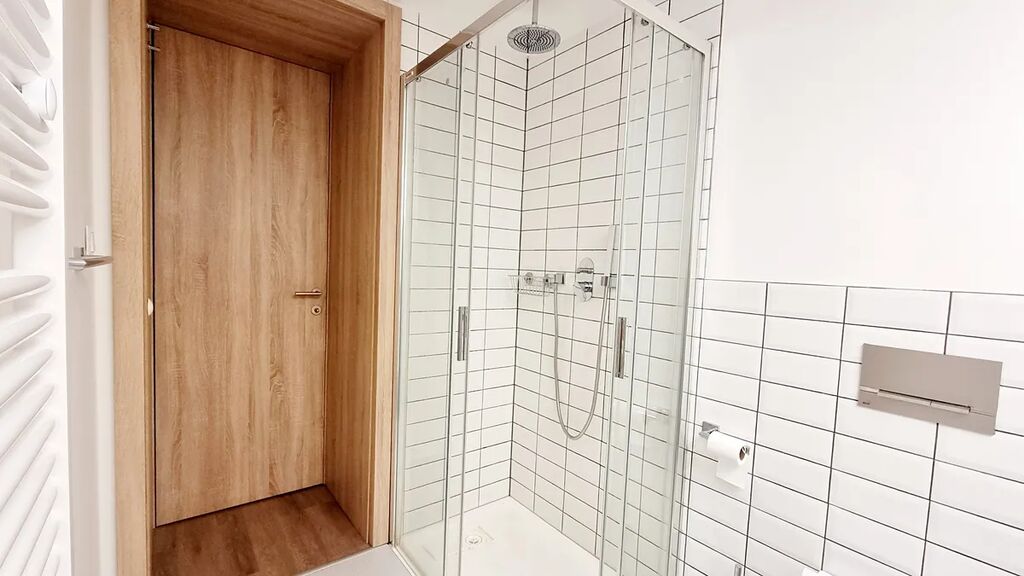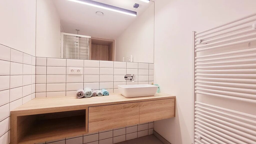 Koupelna (40 m²) má sprchový kout, umyvadlo se skříňkami, toaletu a otopný žebřík.